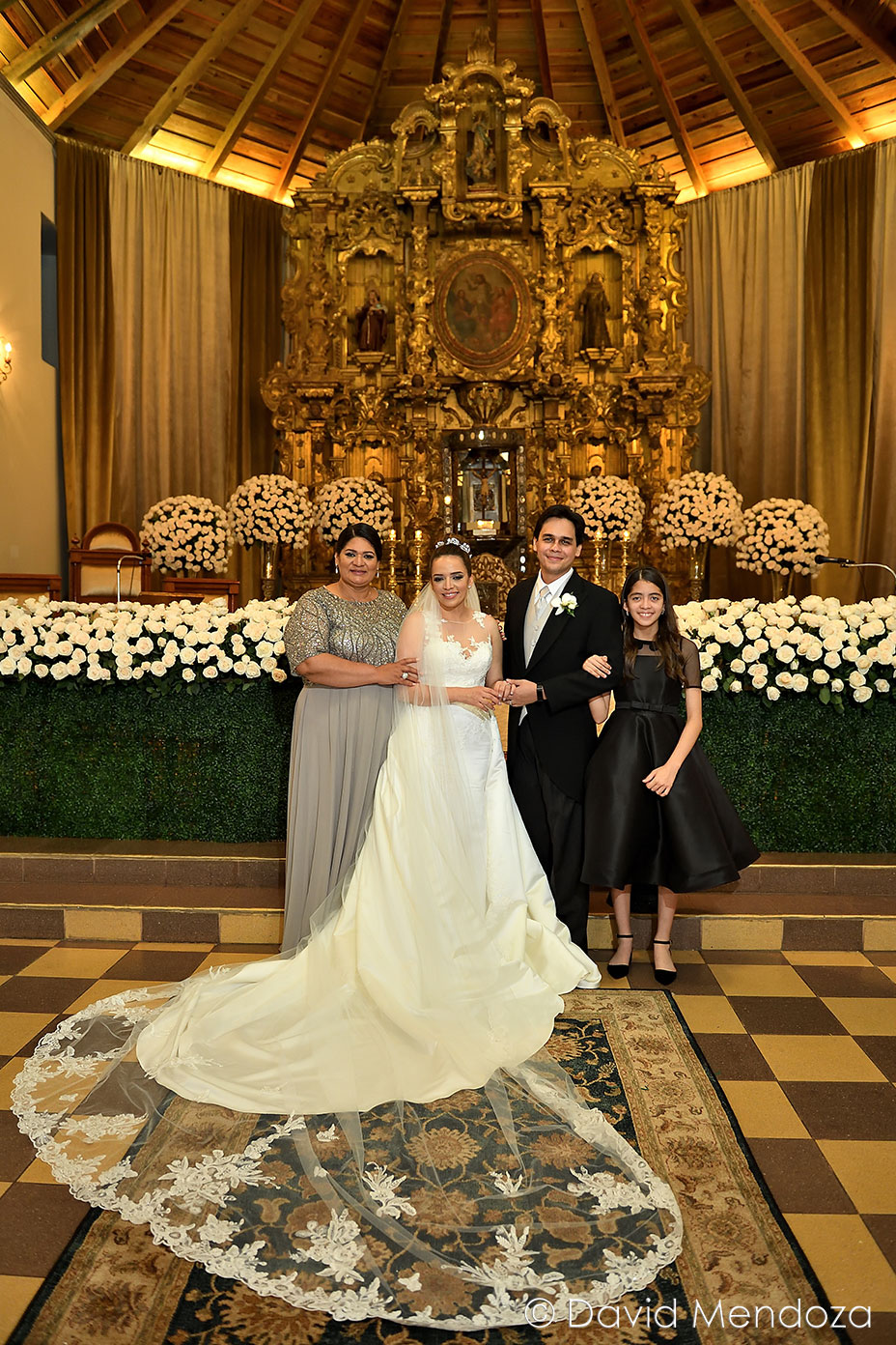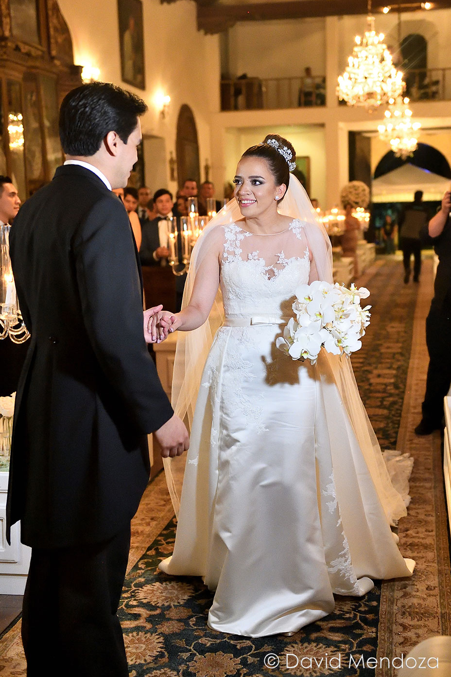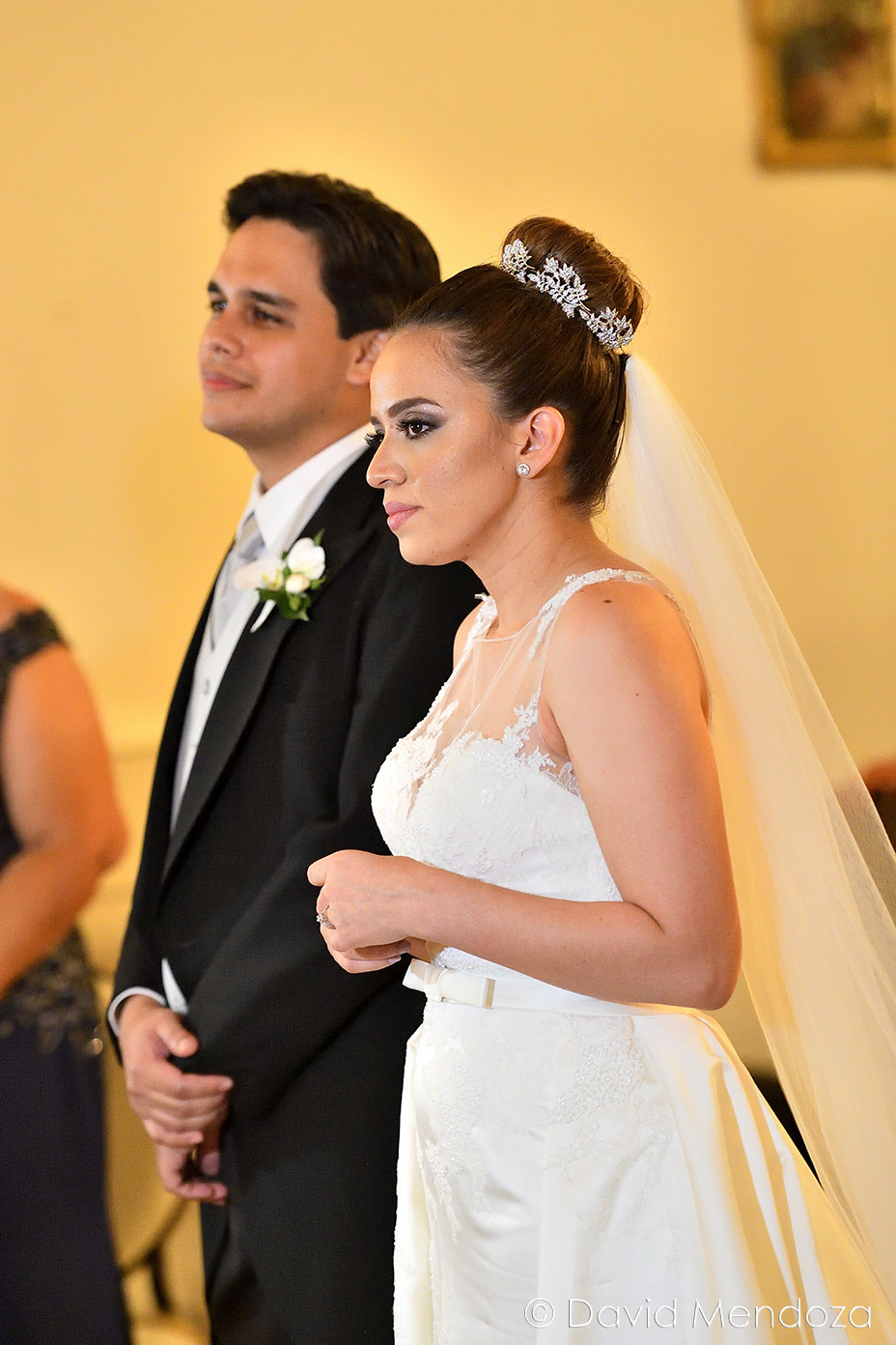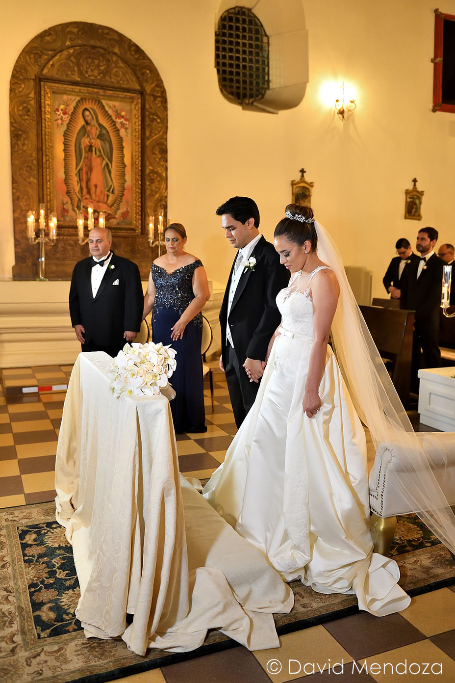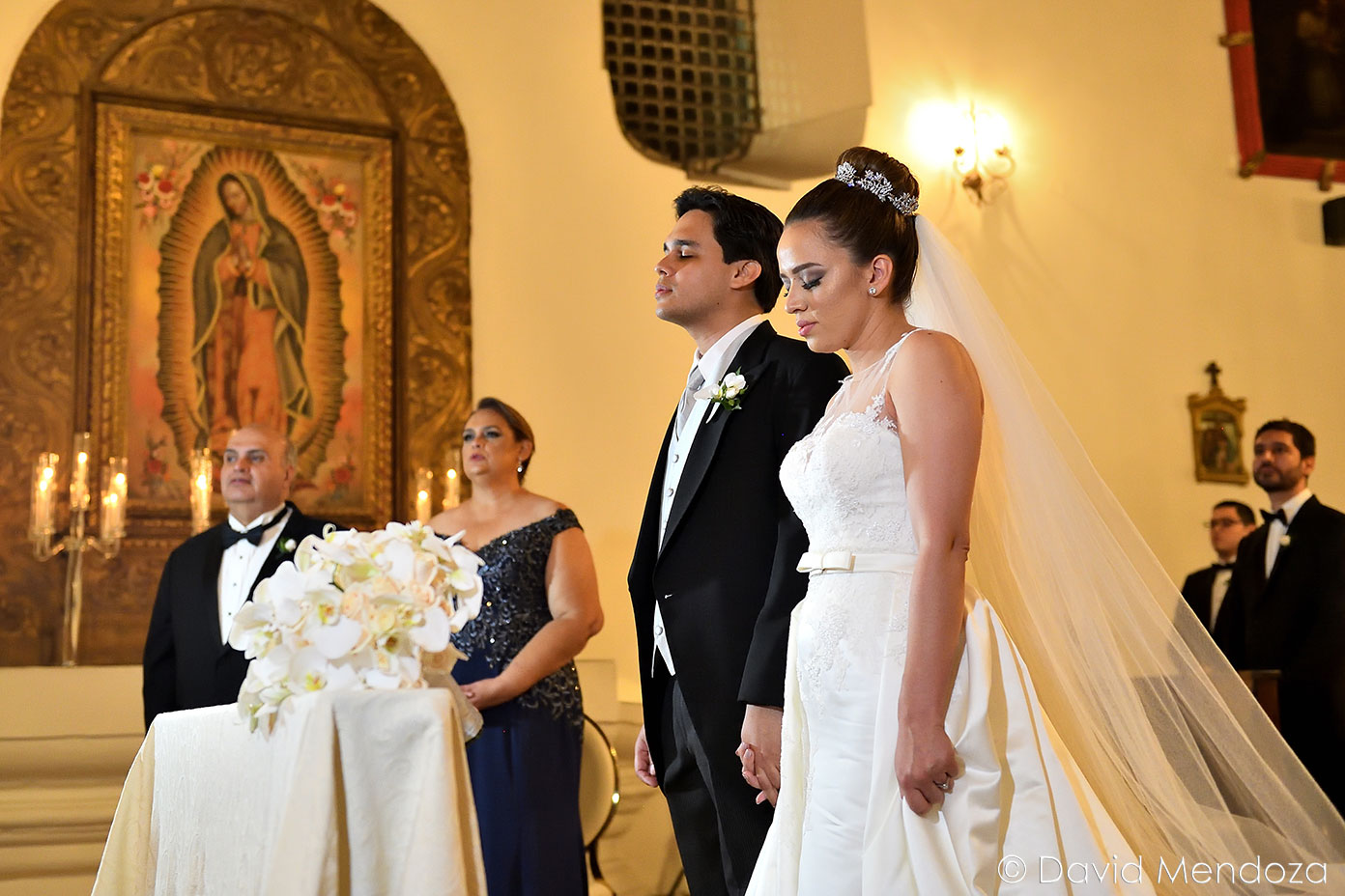 La novia lucía un vestido de corte clásico, con escote ilusión y hermoso velo catedral con aplicación de encaje floral.