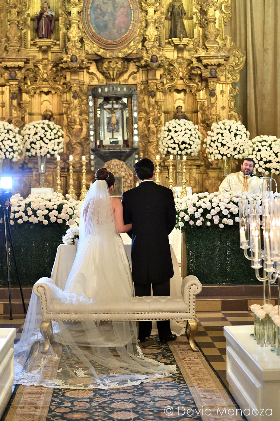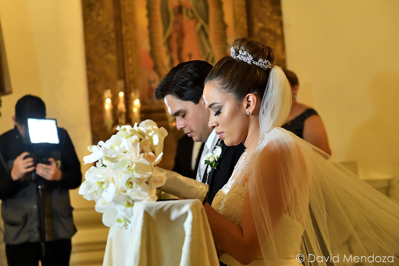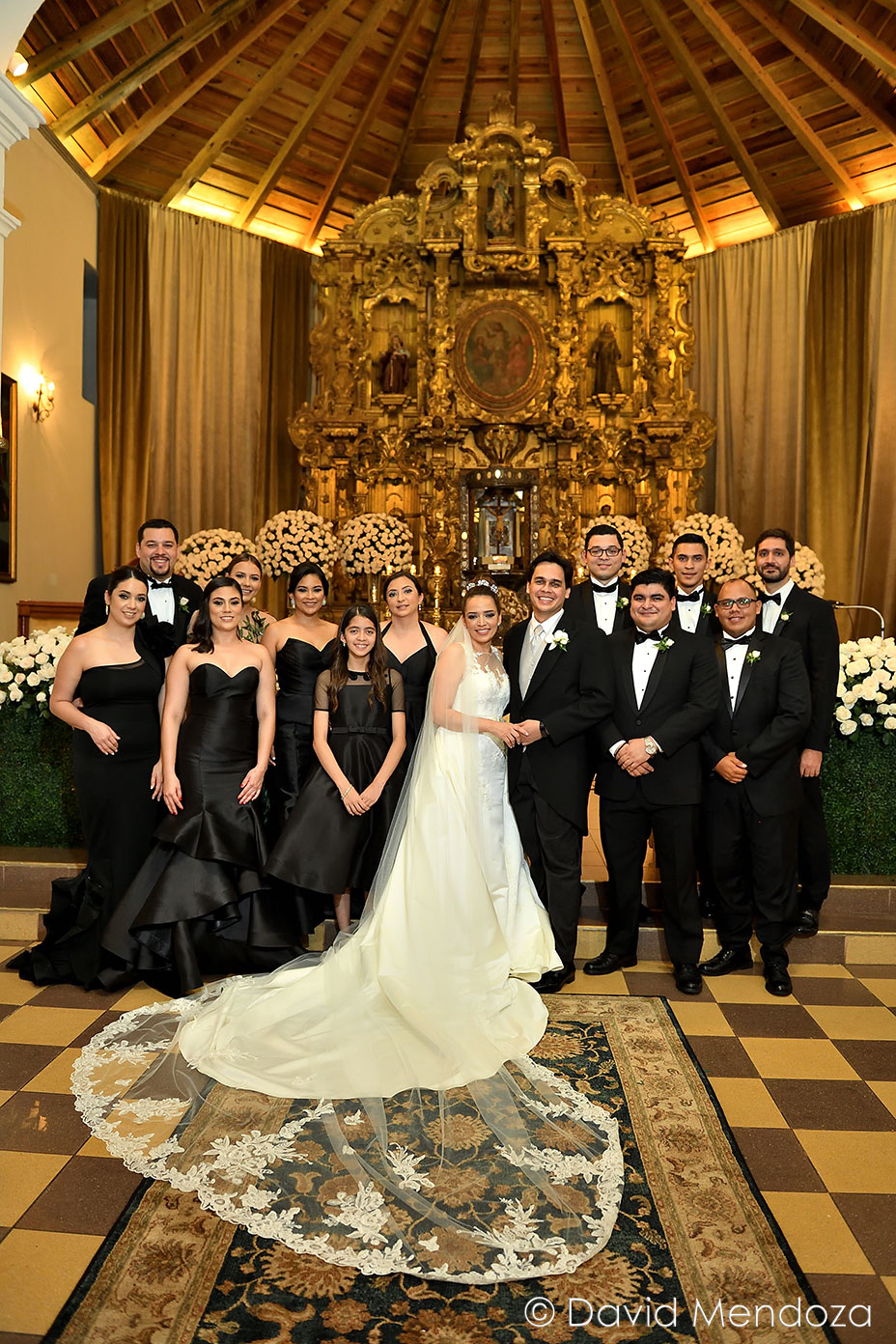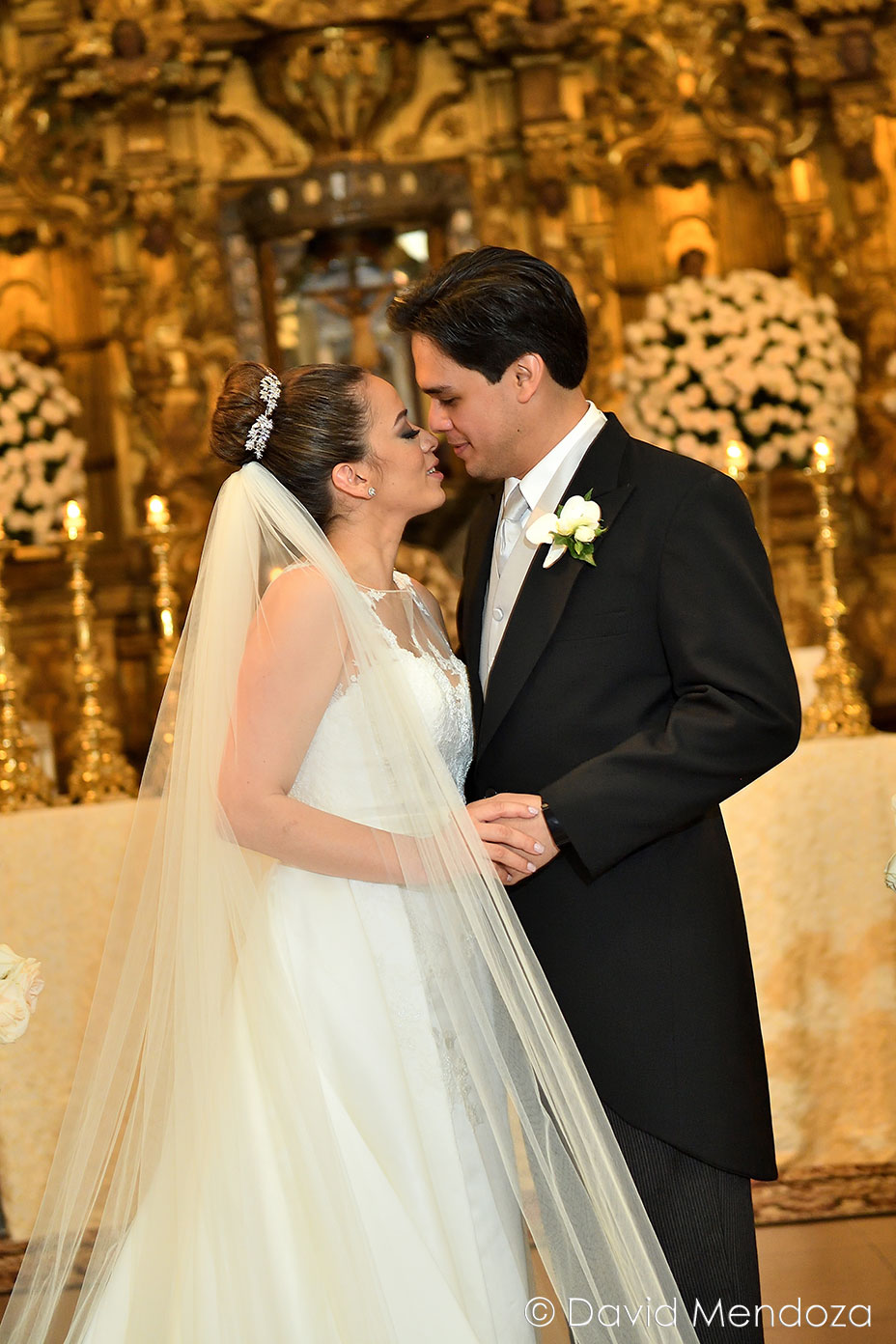 La novia lucía un vestido de corte clásico, con escote ilusión y hermoso velo catedral con aplicación de encaje floral.