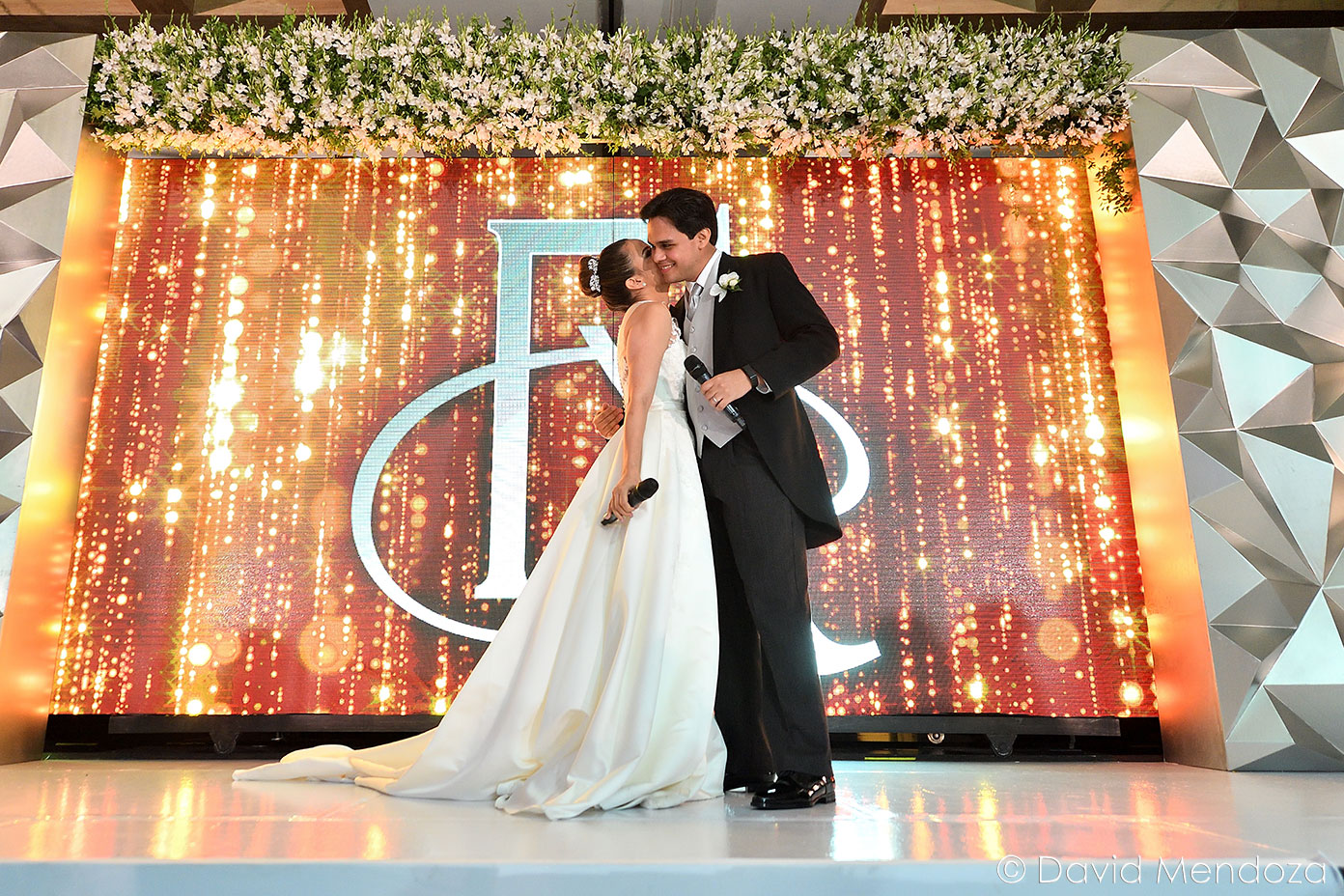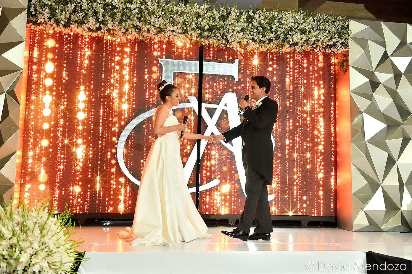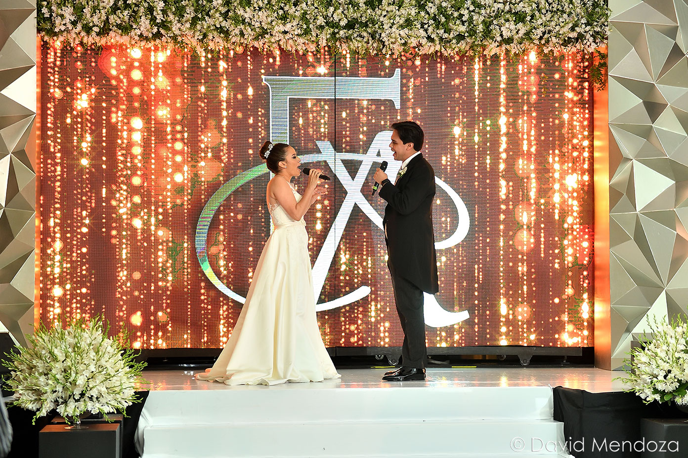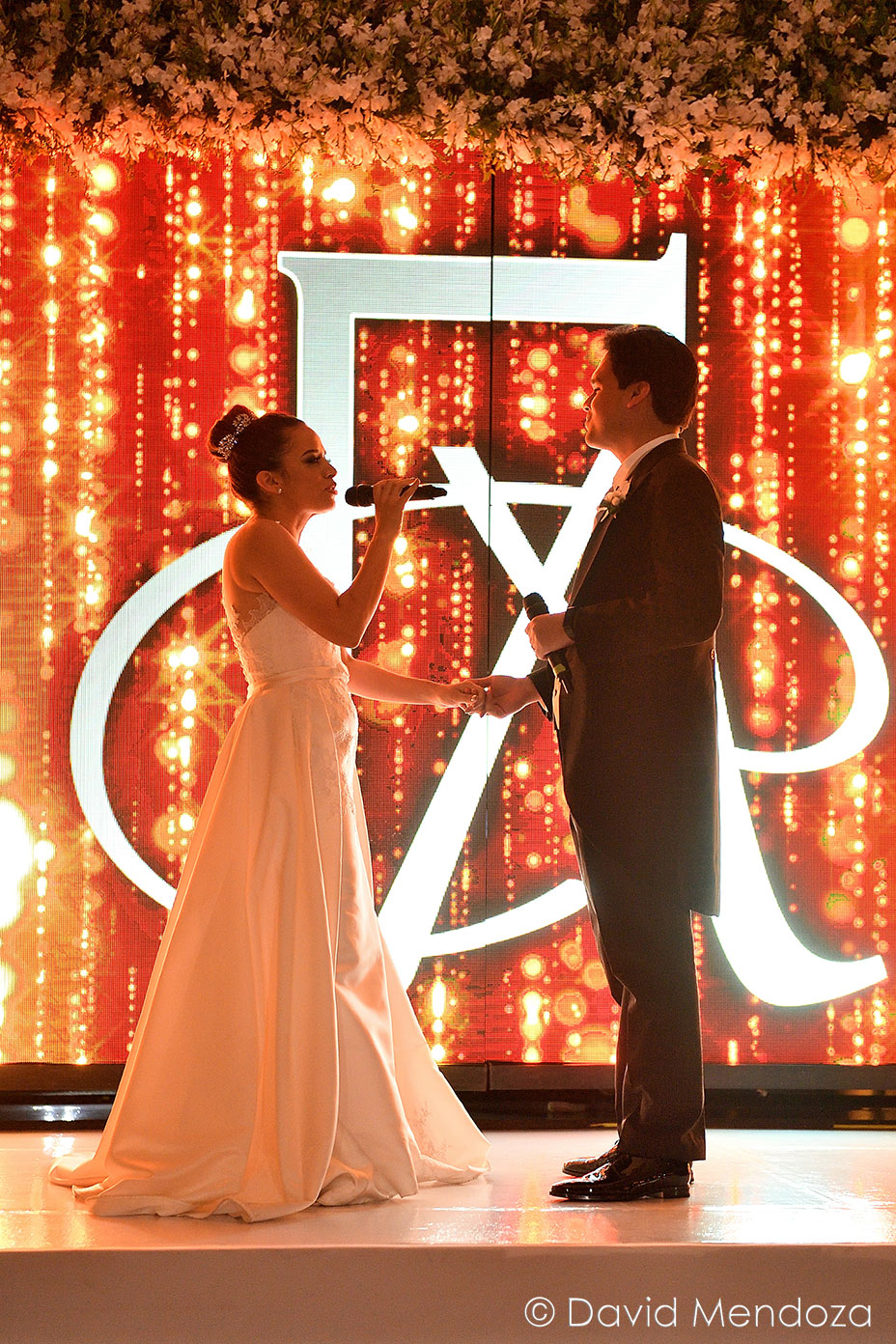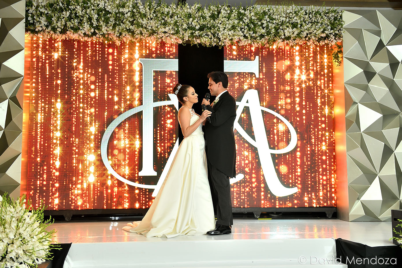 Los novios inauguraron la celebración, entonando juntos una canción. El escenario creado con pantallas led, paneles personalizados y pirotecnia de lluvia fría, enmarcó el momento.