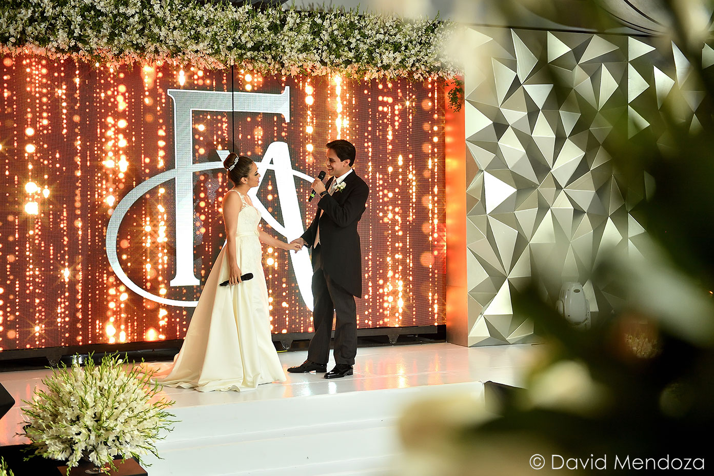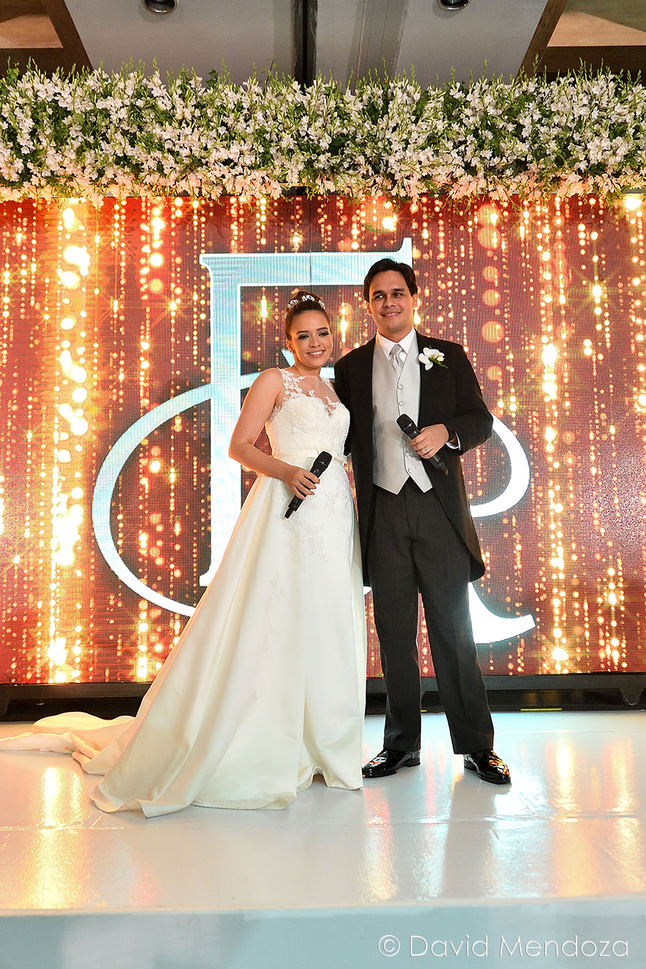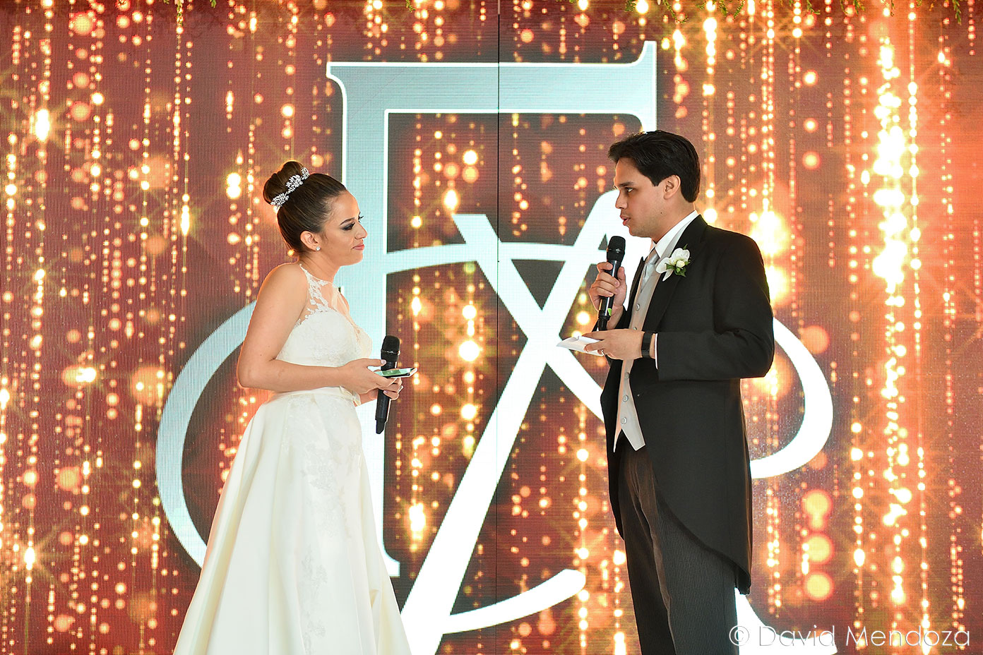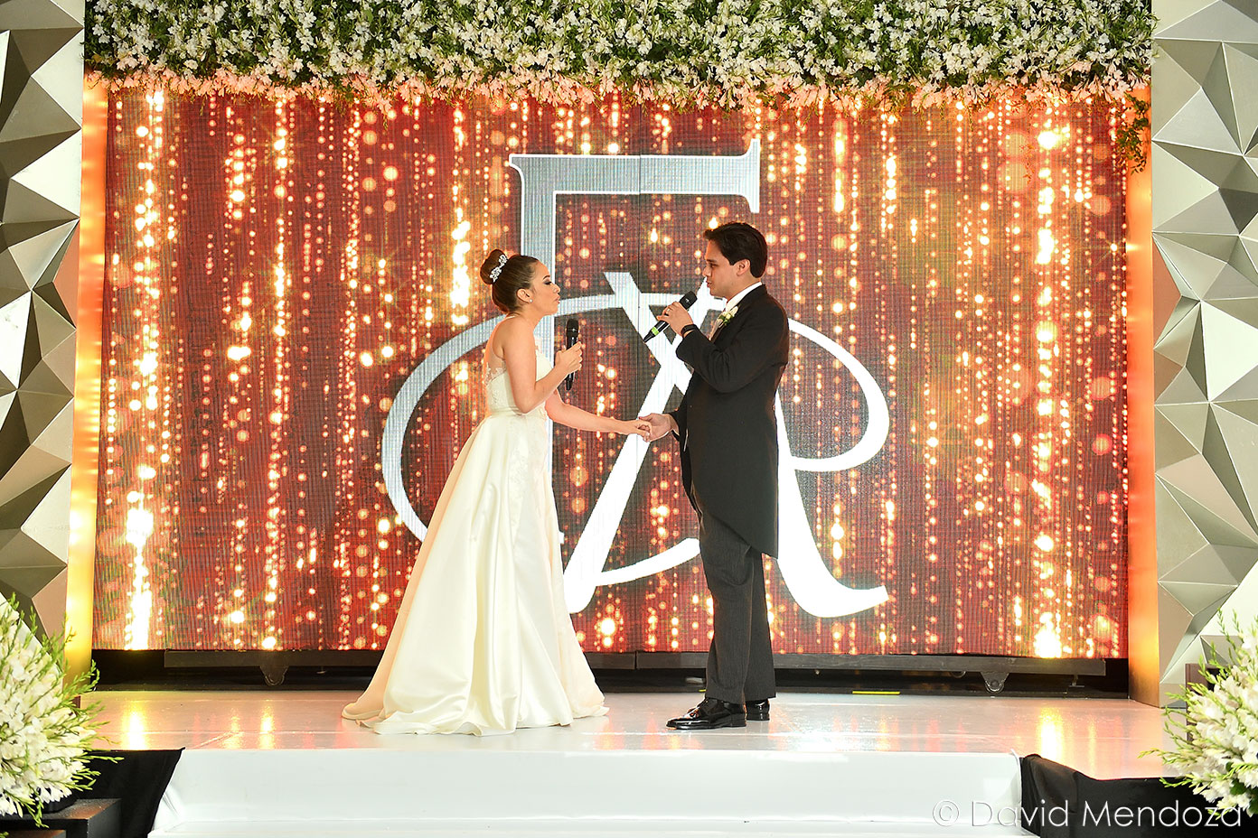 Los novios inauguraron la celebración, entonando juntos una canción. El escenario creado con pantallas led, paneles personalizados y pirotecnia de lluvia fría, enmarcó el momento.