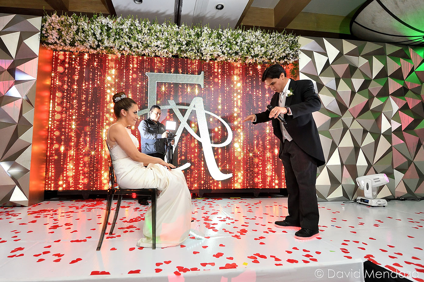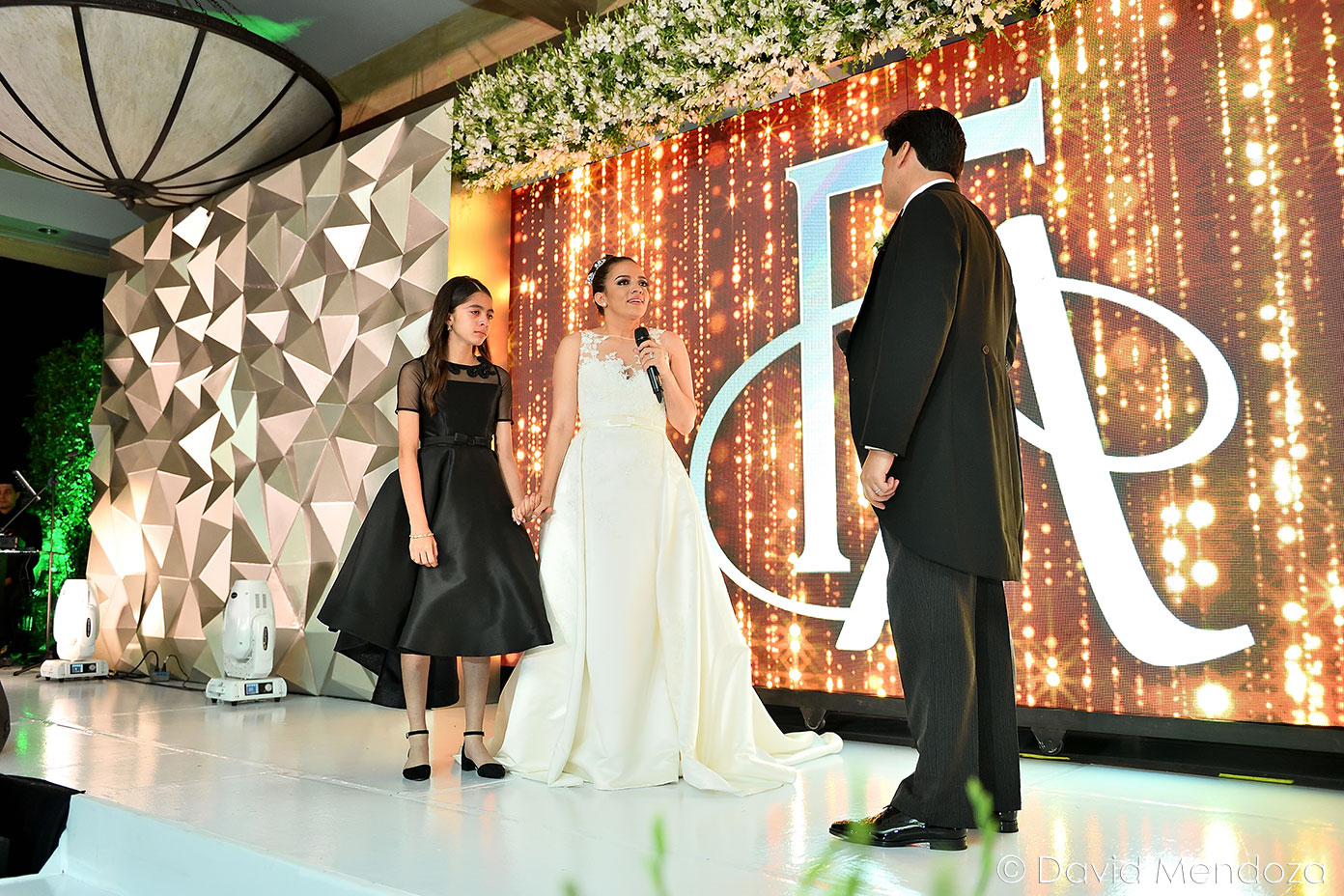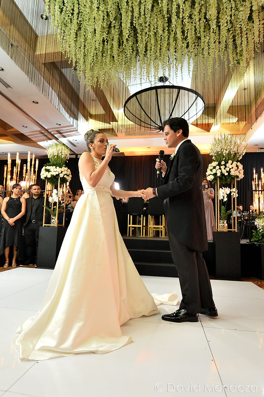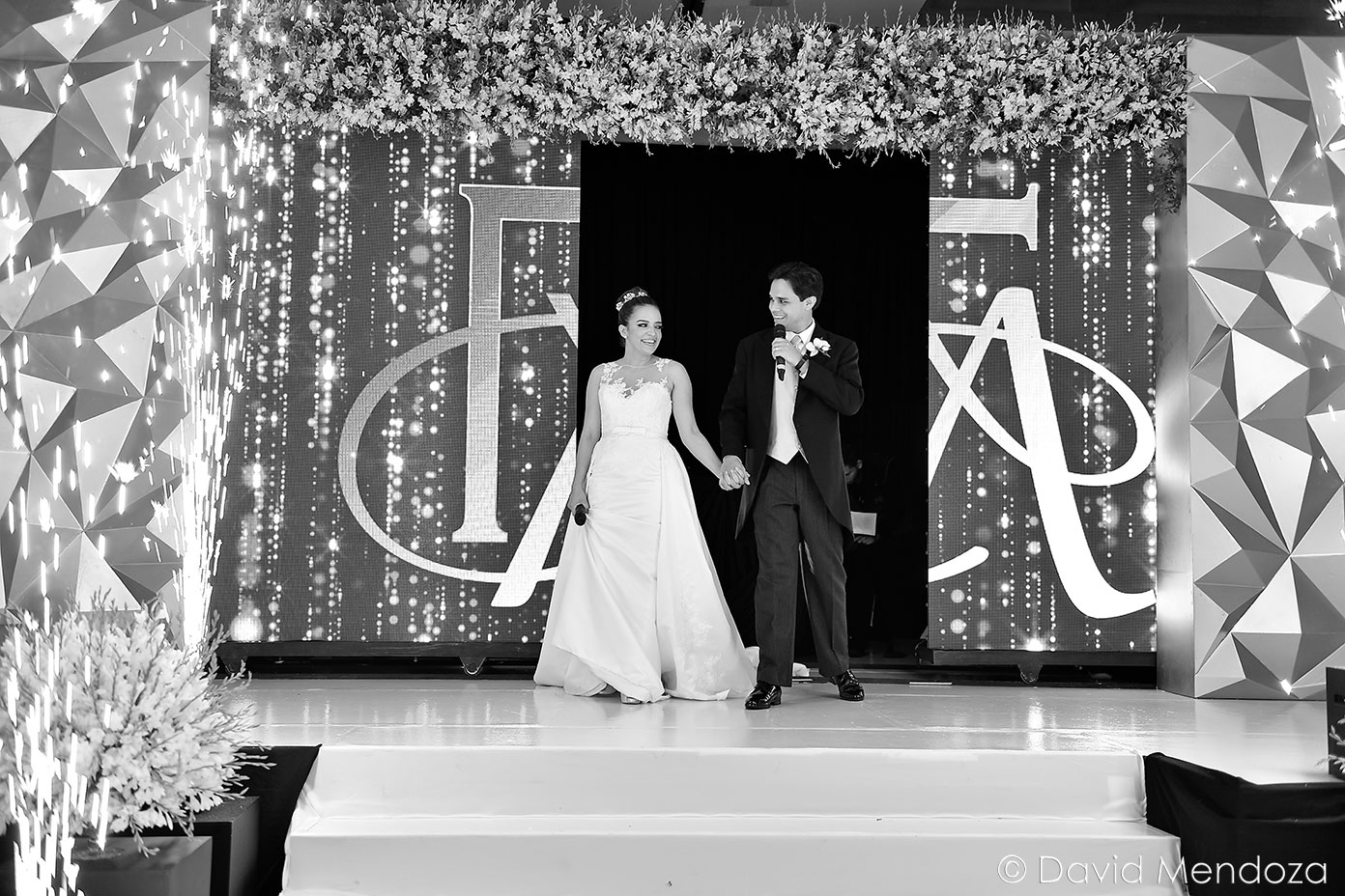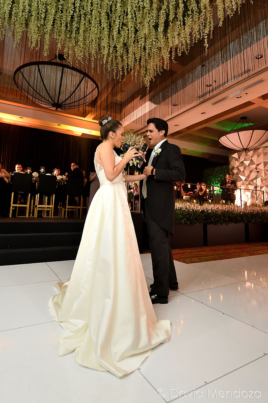 Los novios inauguraron la celebración, entonando juntos una canción. El escenario creado con pantallas led, paneles personalizados y pirotecnia de lluvia fría, enmarcó el momento.
