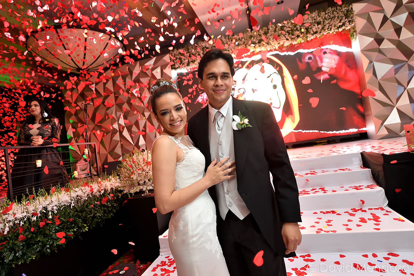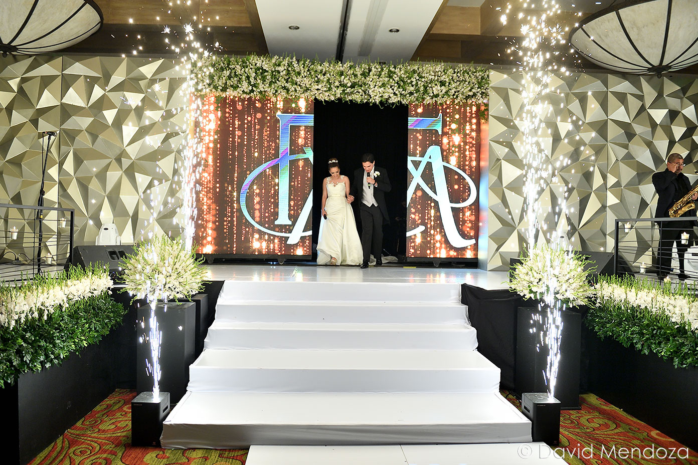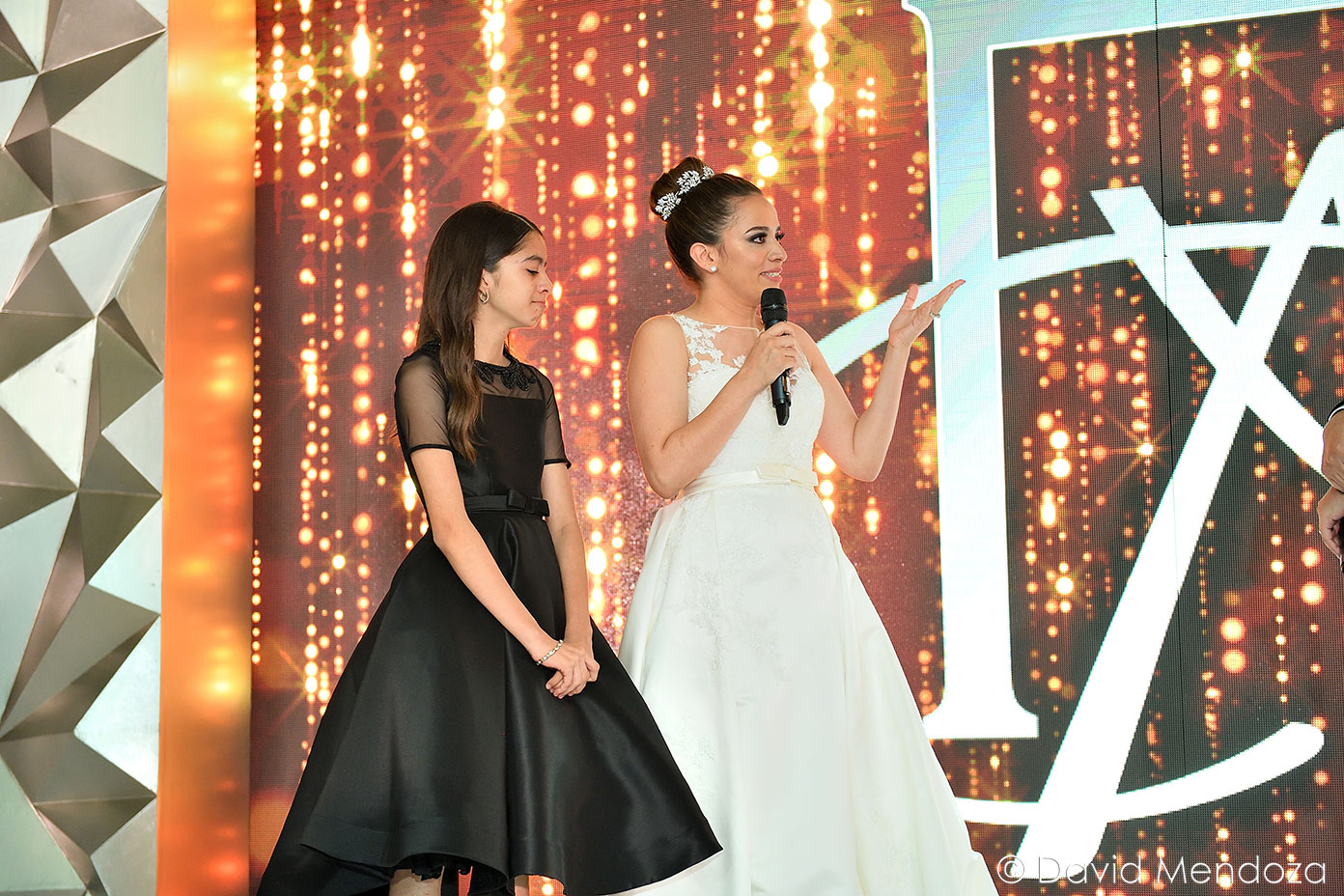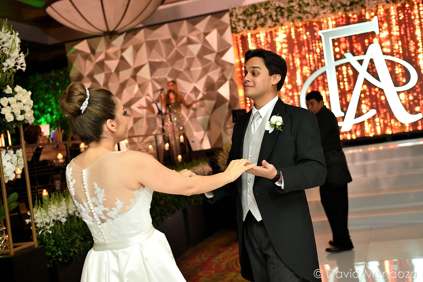 Los novios inauguraron la celebración, entonando juntos una canción. El escenario creado con pantallas led, paneles personalizados y pirotecnia de lluvia fría, enmarcó el momento.