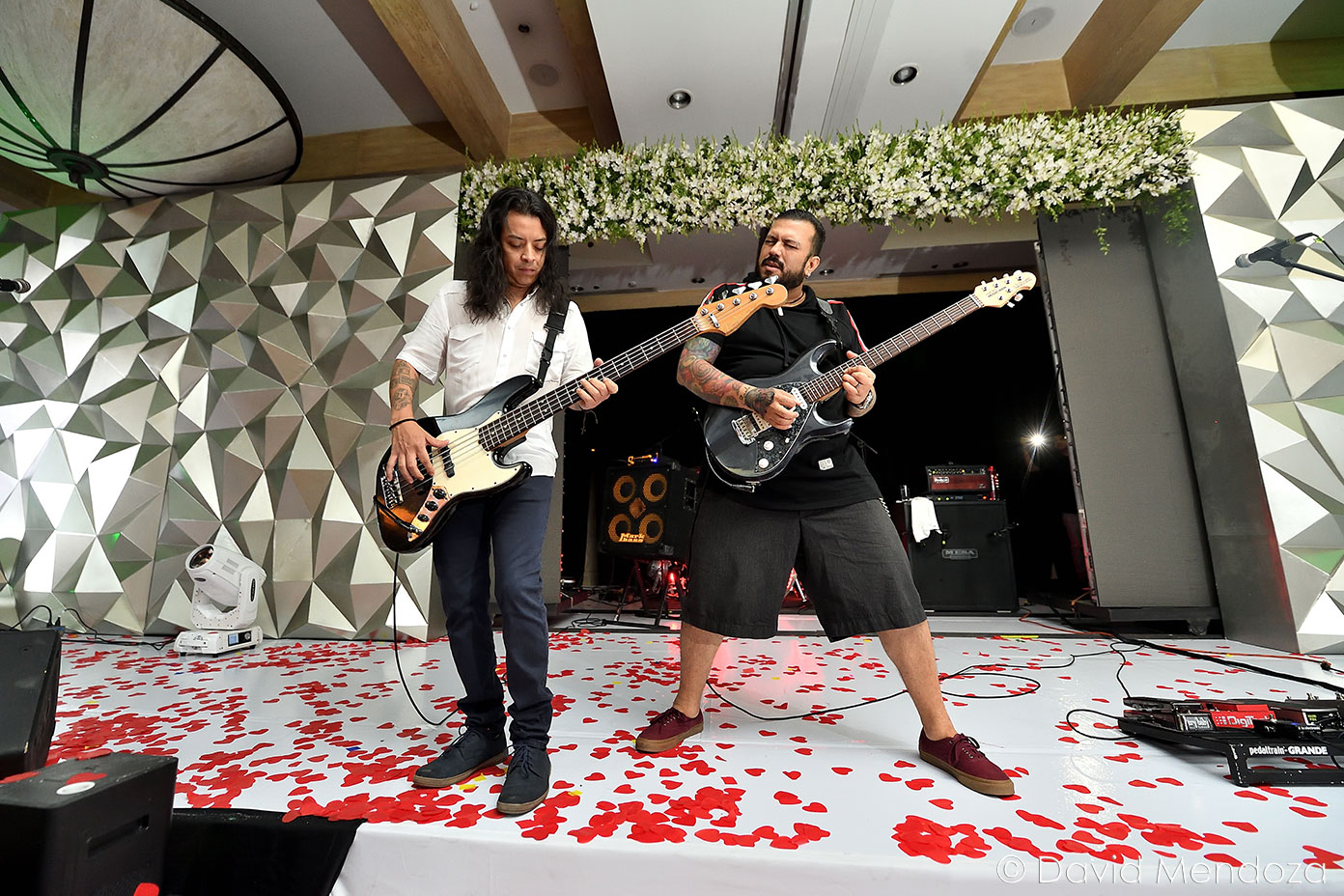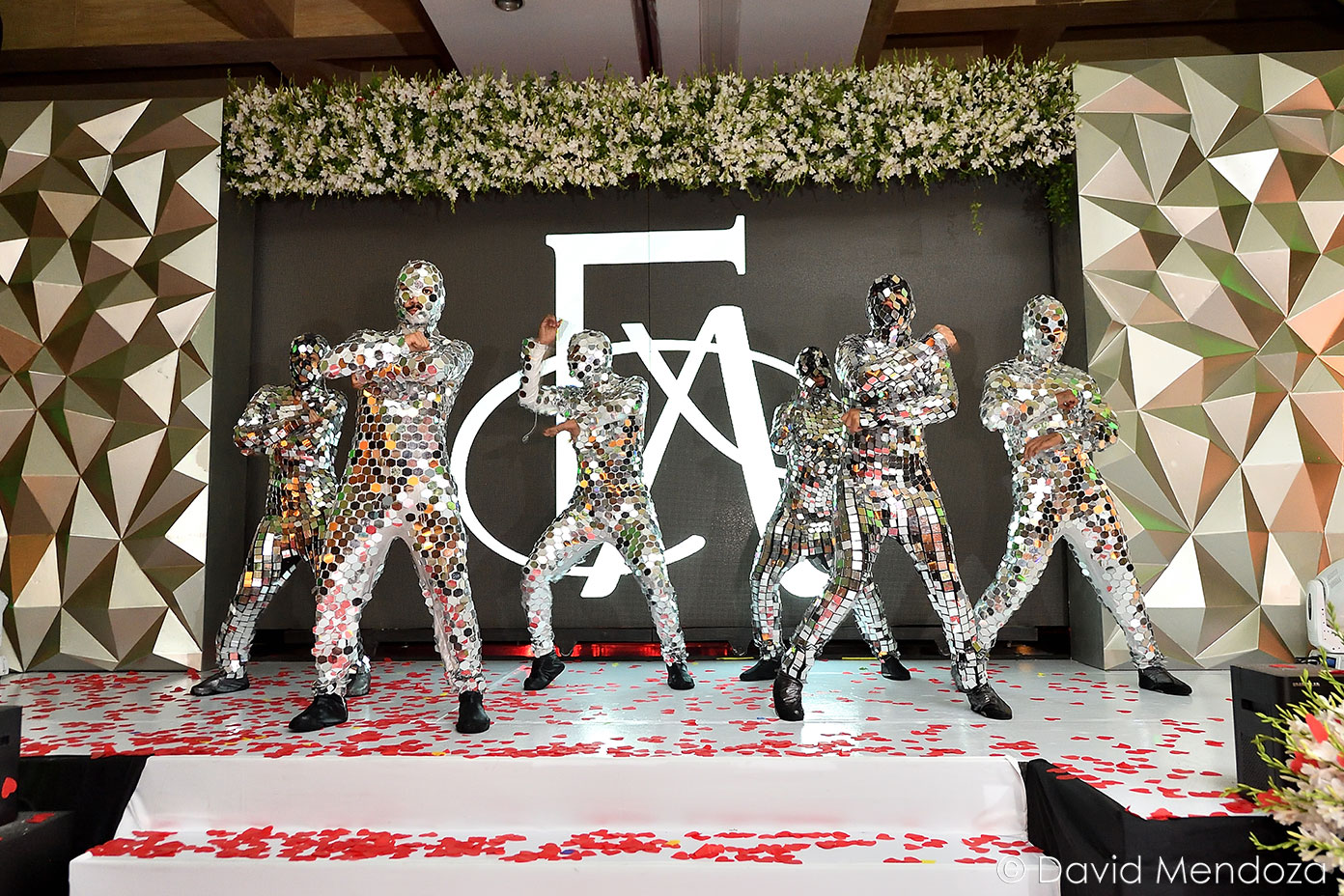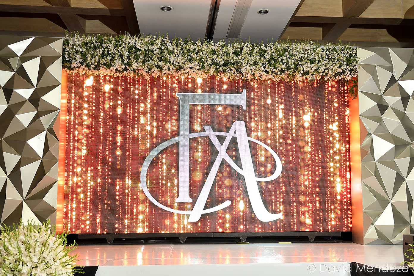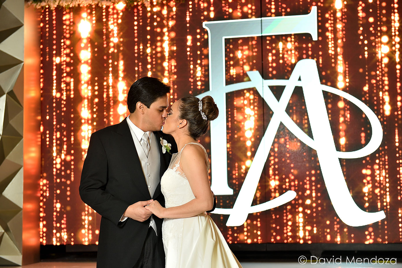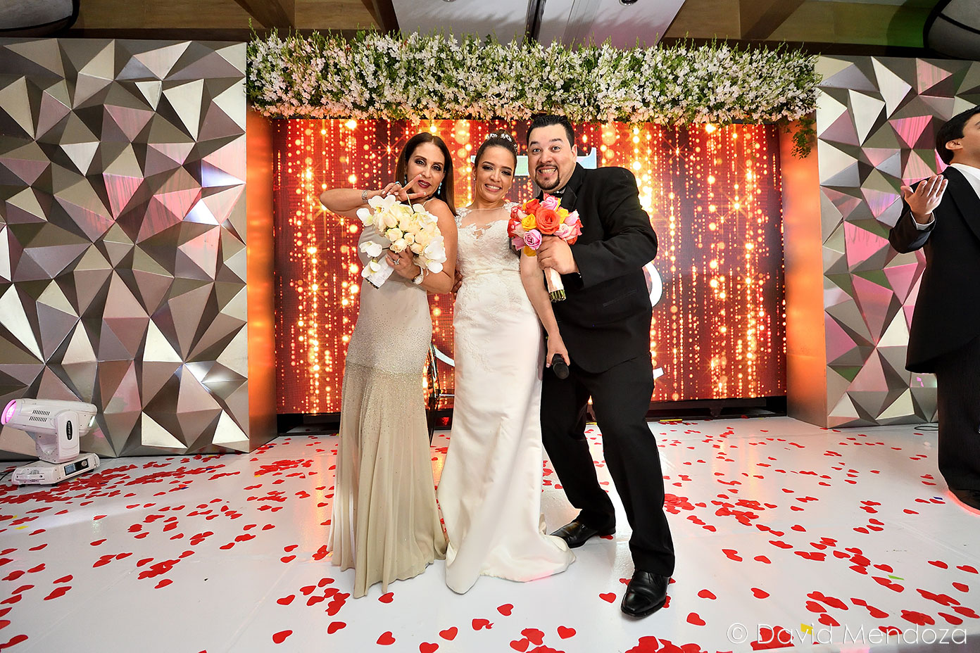 Los novios inauguraron la celebración, entonando juntos una canción. El escenario creado con pantallas led, paneles personalizados y pirotecnia de lluvia fría, enmarcó el momento.