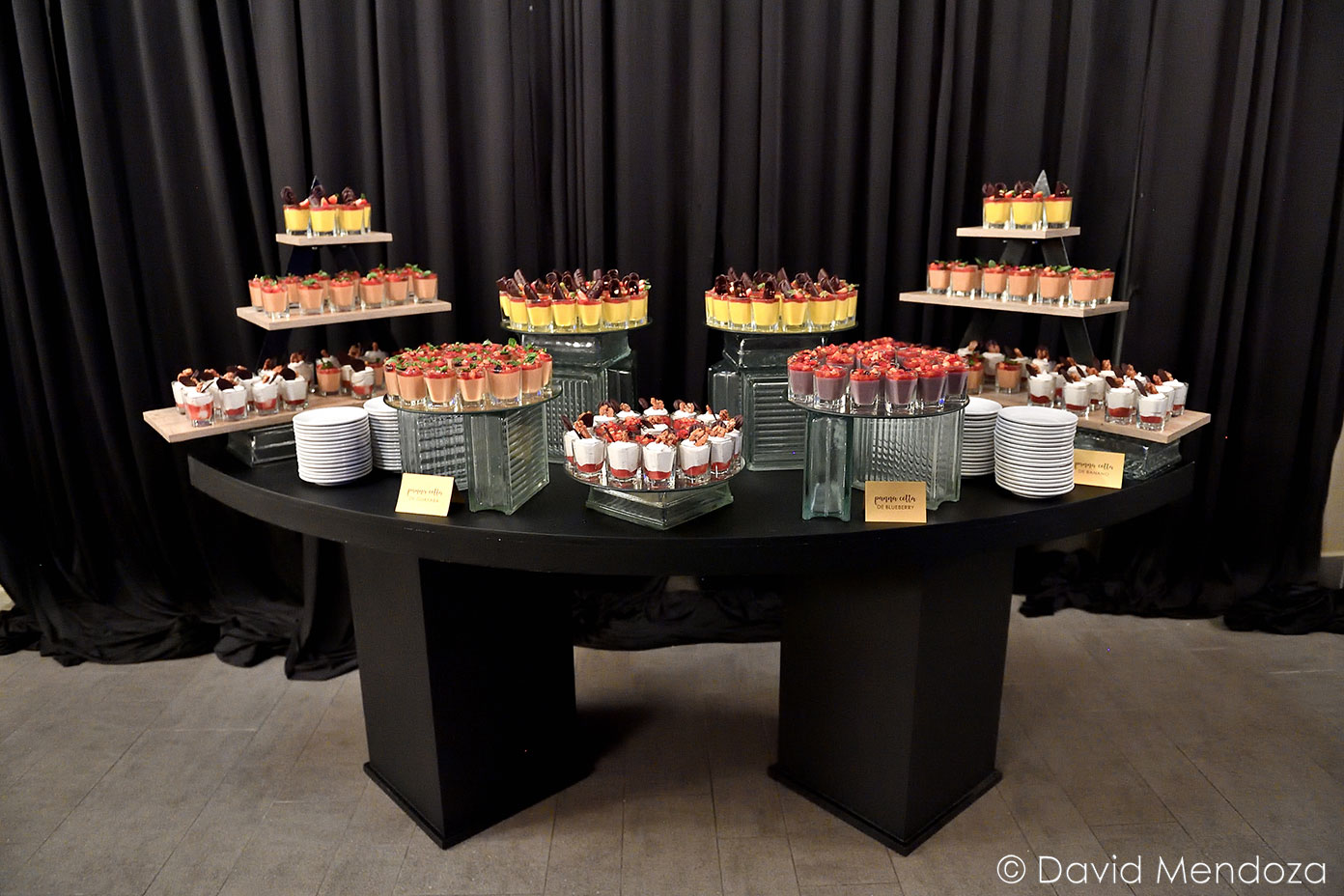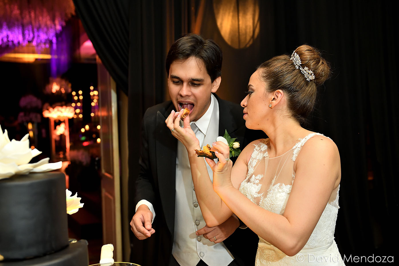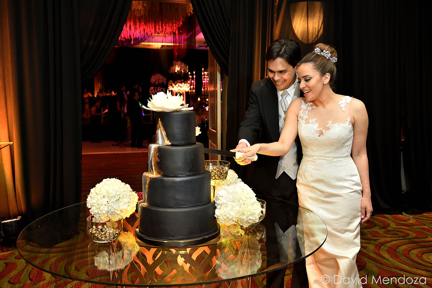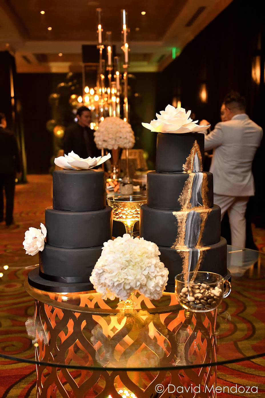 Además, la torta nupcial resaltó, por su inusual tono black mate, con una cascada esbozada en tonos dorado y blanco hueso.