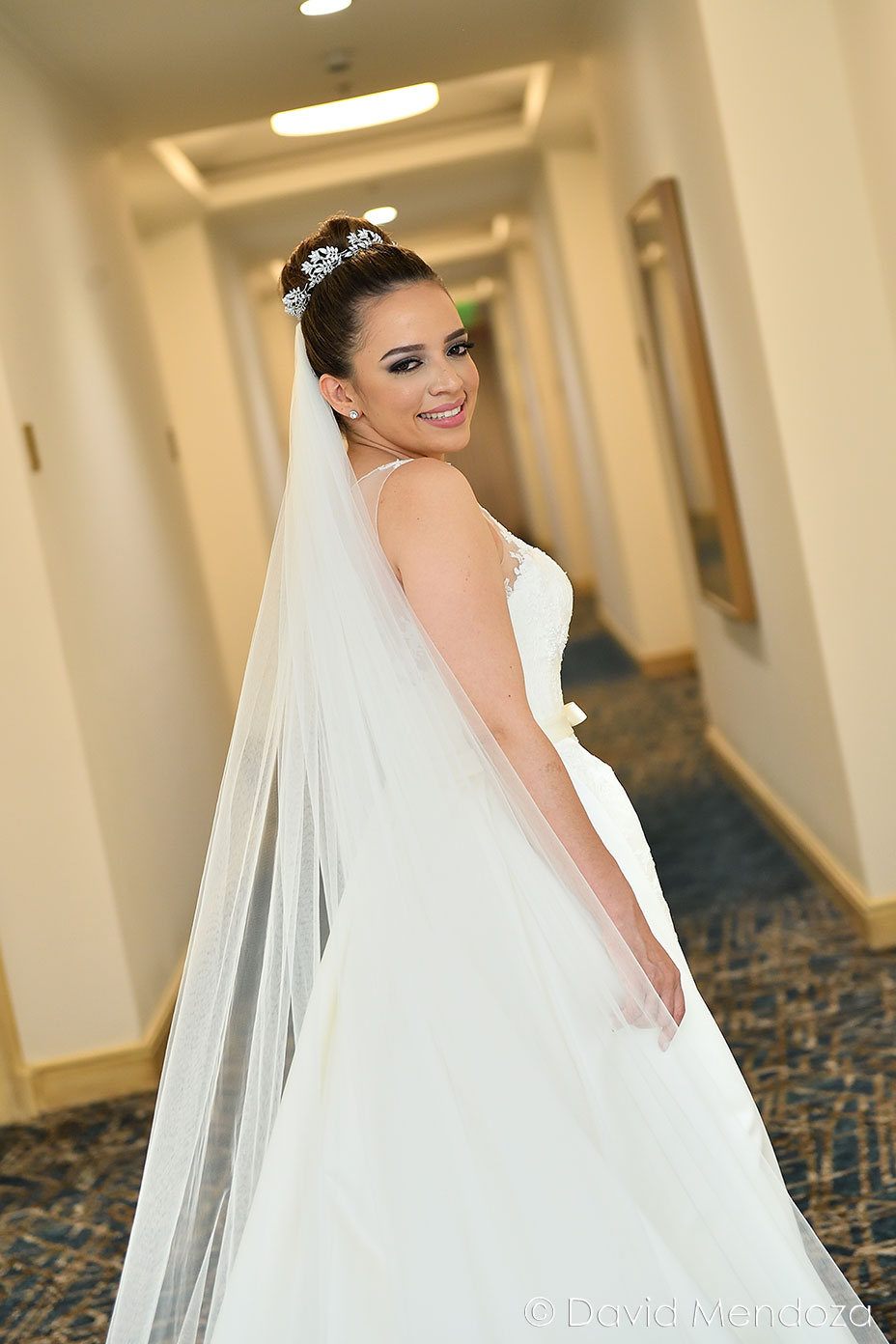 La novia lucía un vestido de corte clásico, con escote ilusión y hermoso velo catedral con aplicación de encaje floral.