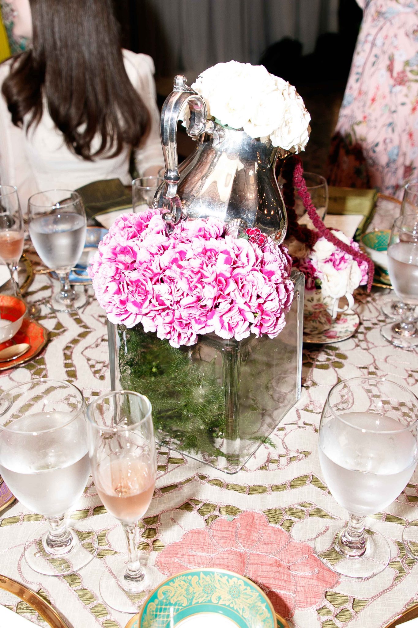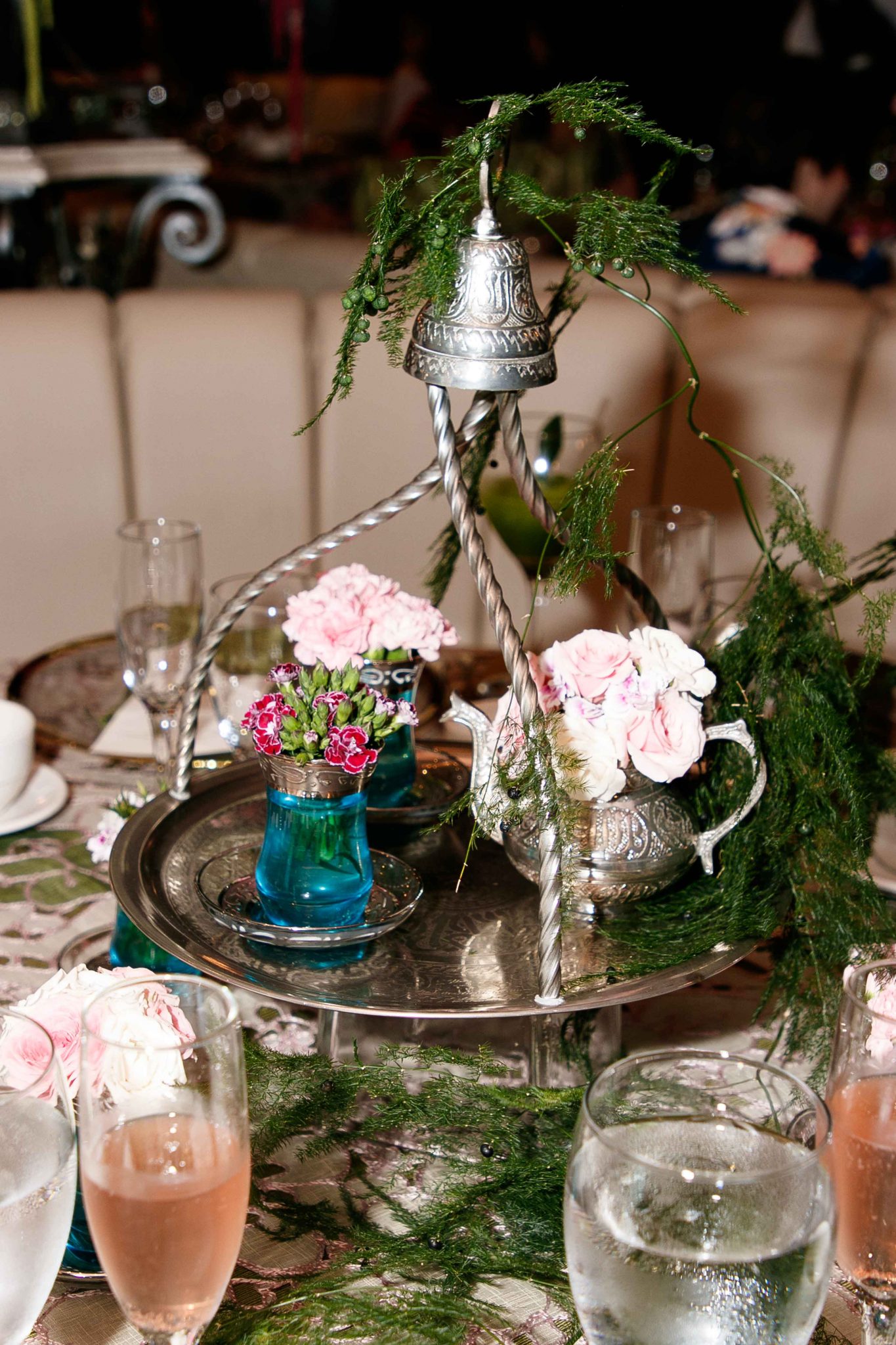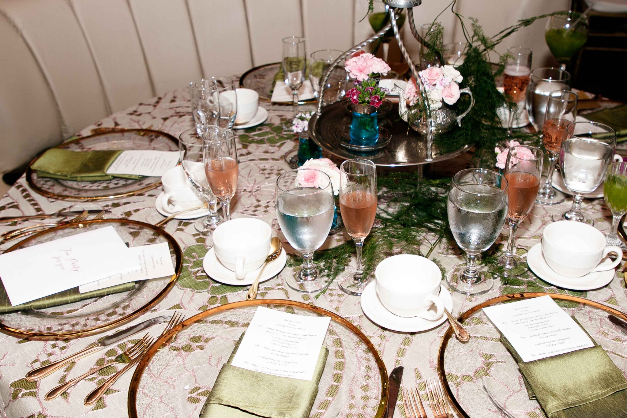 Los arreglos fueron concebidos con claveles, rosas, amarantos fuscia y verde y enormes hojas exóticas, que dieron como resultado, una atmósfera de rotunda sofisticación en cada mesa. Se utilizaron salas modernas estilo Chester para recrear un bistro de lo más exclusivo de Paris.