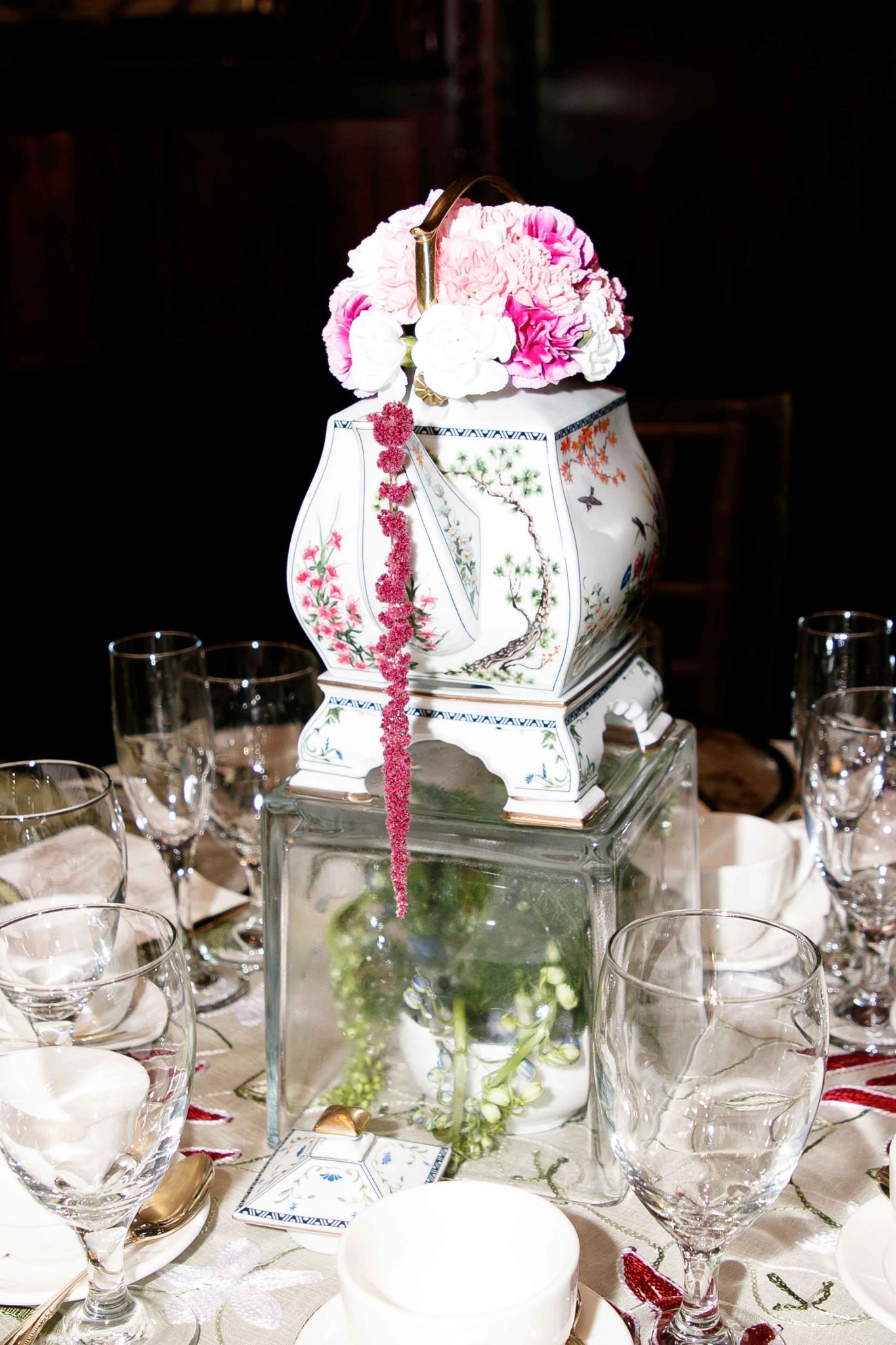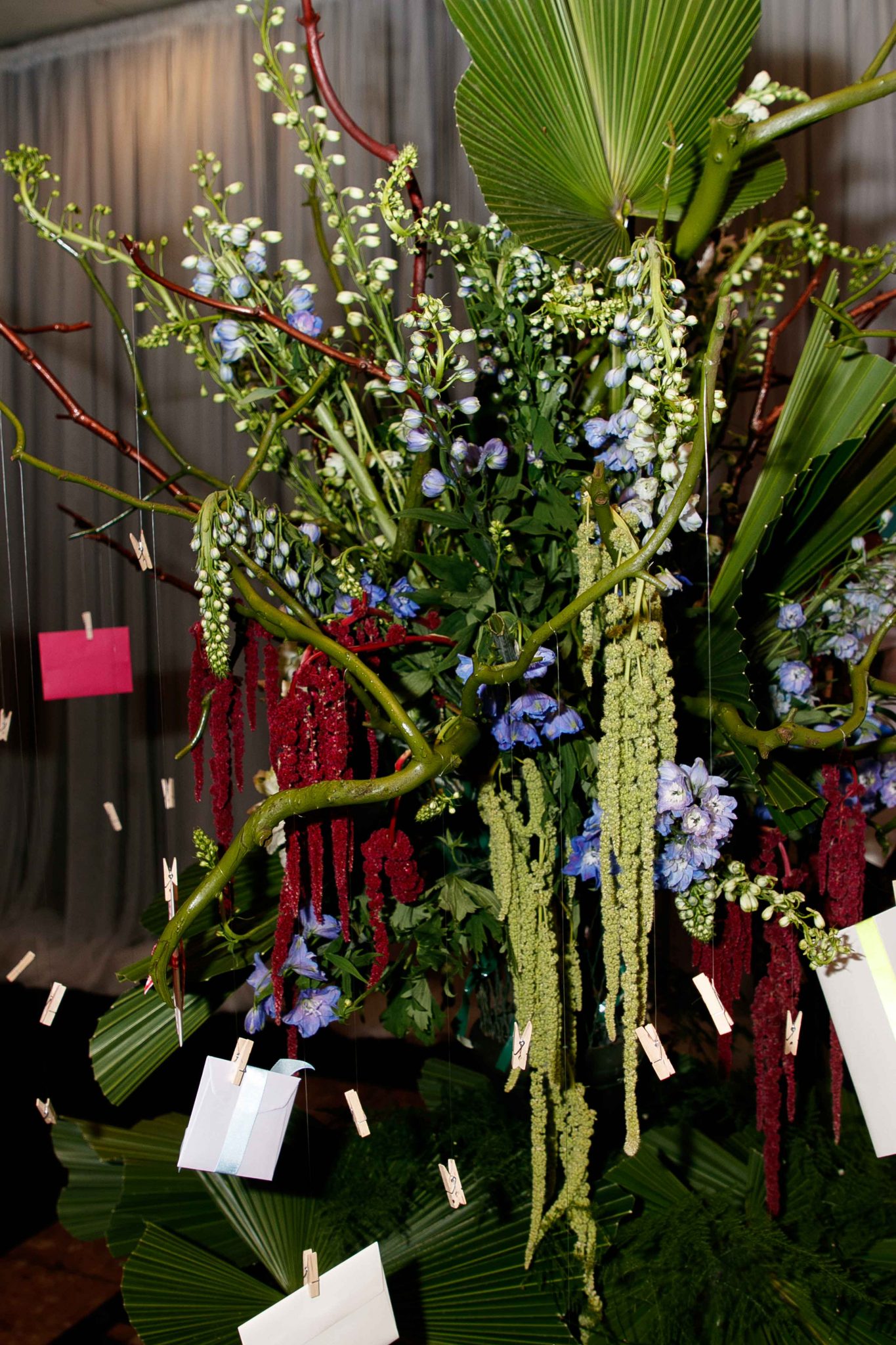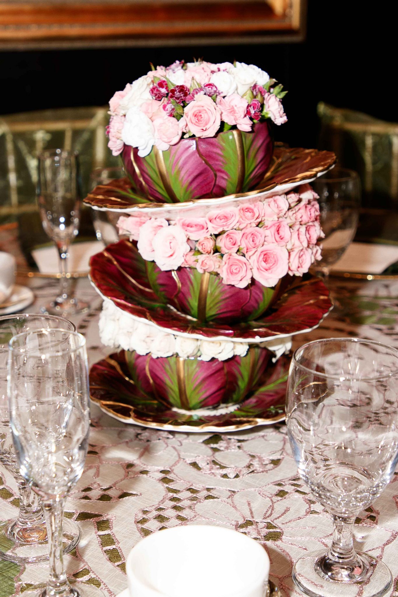 Los arreglos fueron concebidos con claveles, rosas, amarantos fuscia y verde y enormes hojas exóticas, que dieron como resultado, una atmósfera de rotunda sofisticación en cada mesa. Se utilizaron salas modernas estilo Chester para recrear un bistro de lo más exclusivo de Paris.