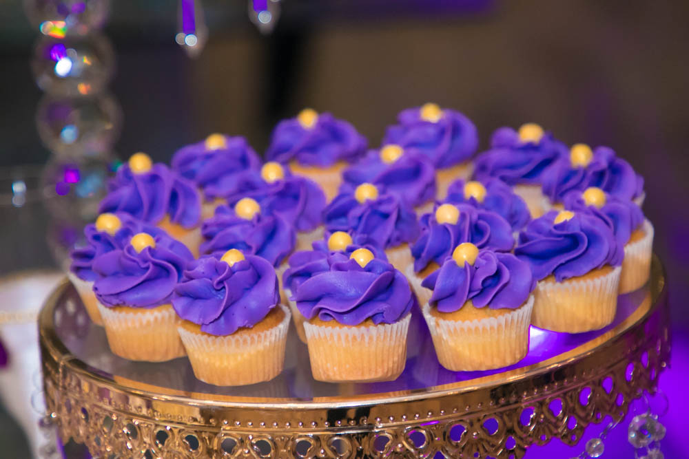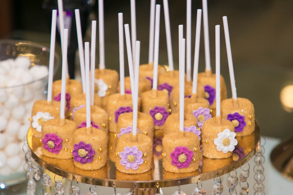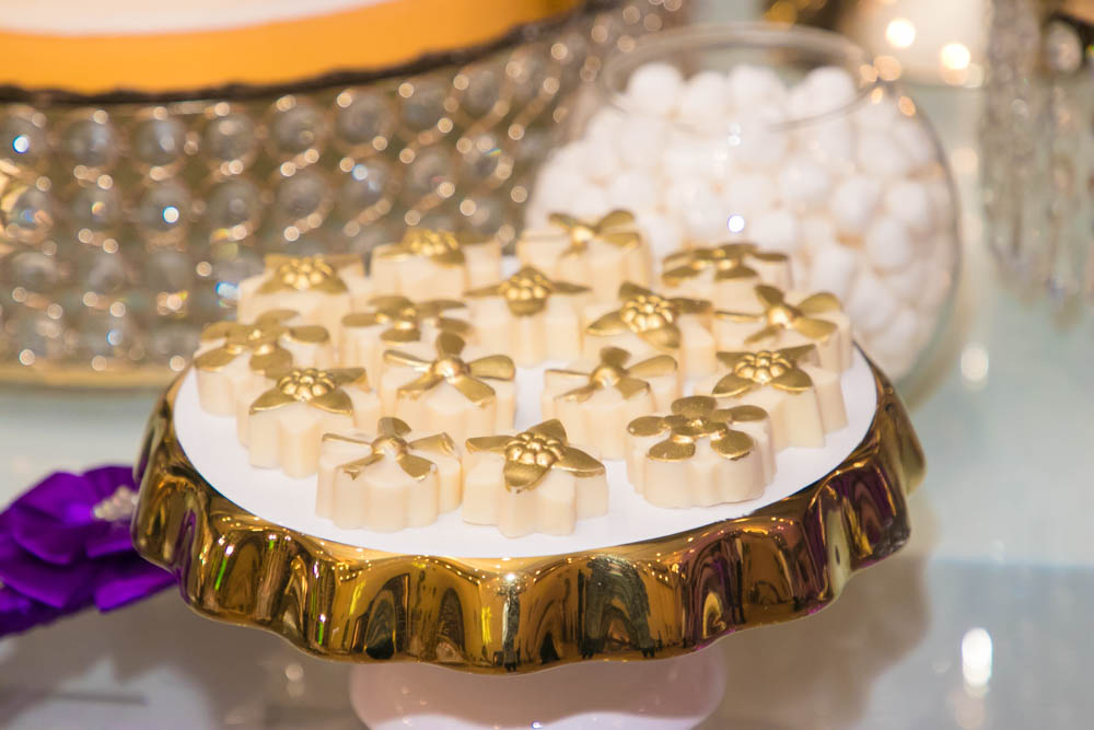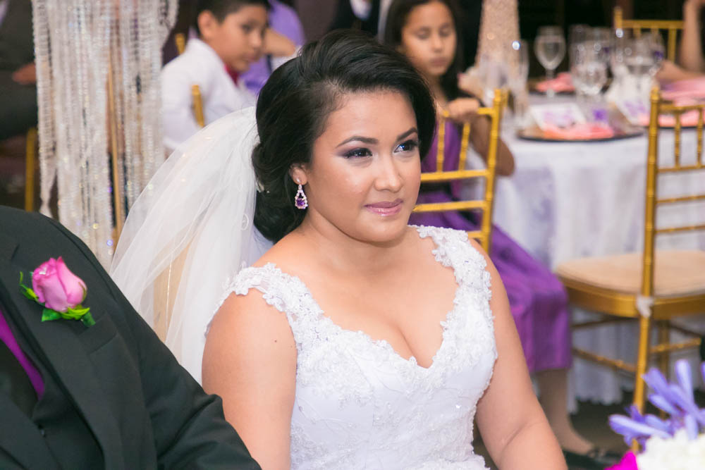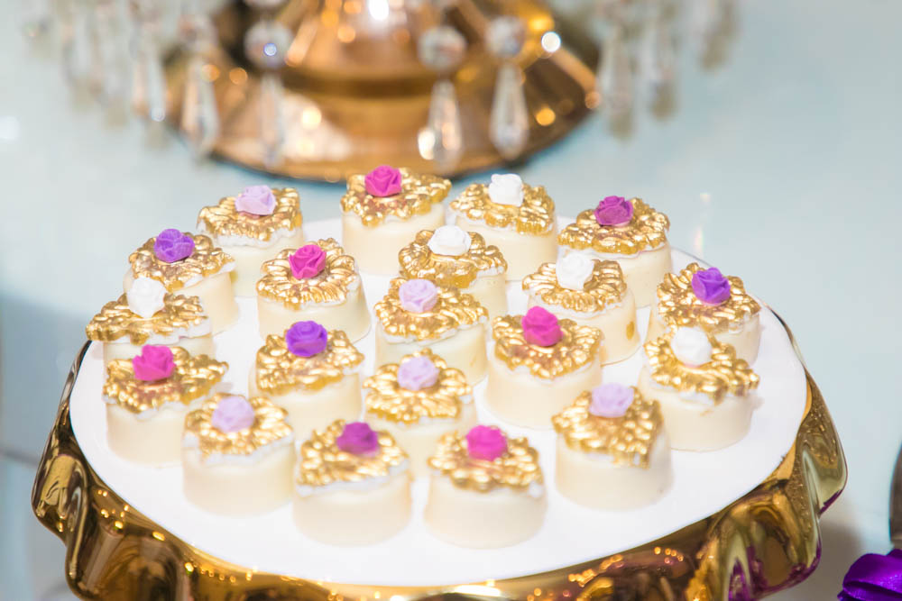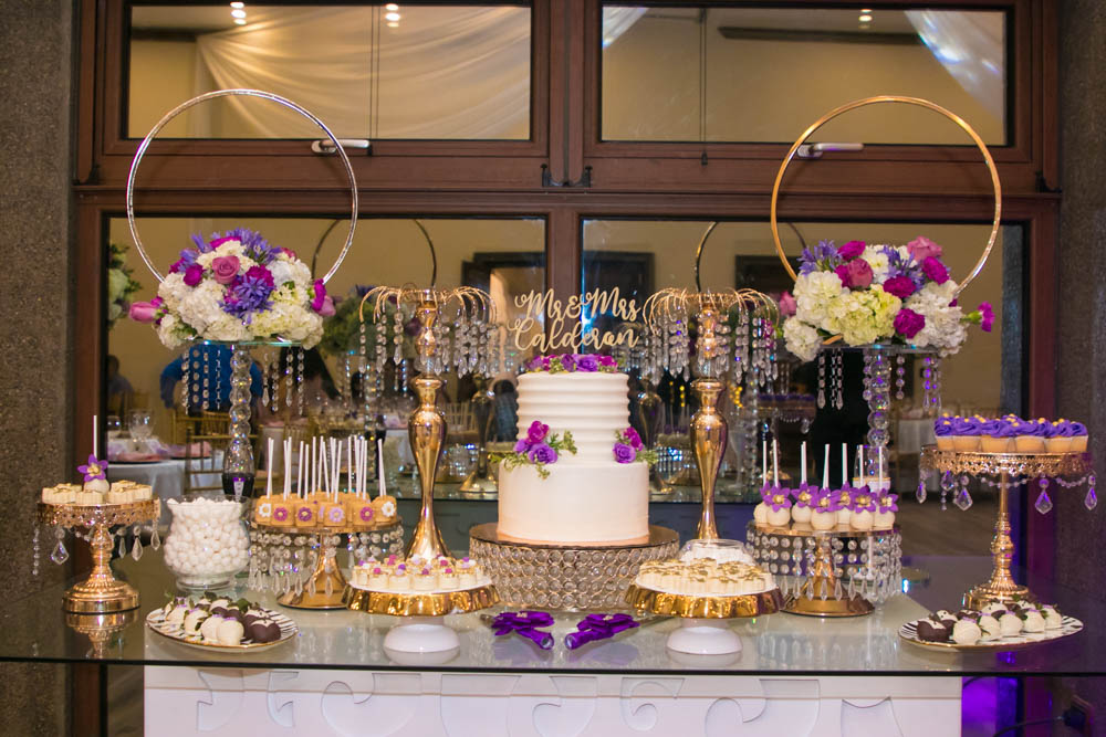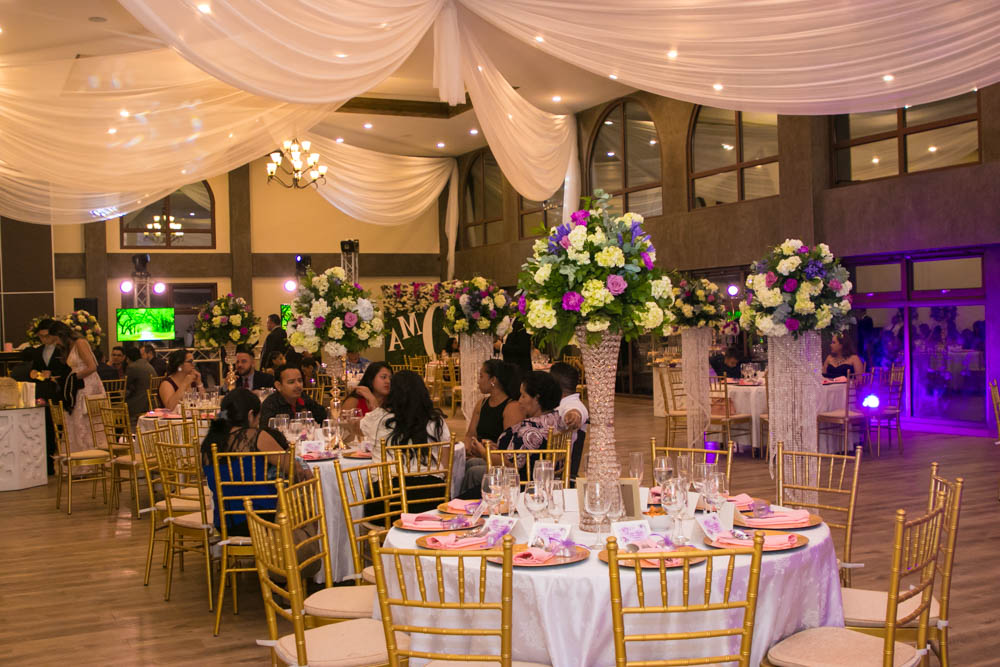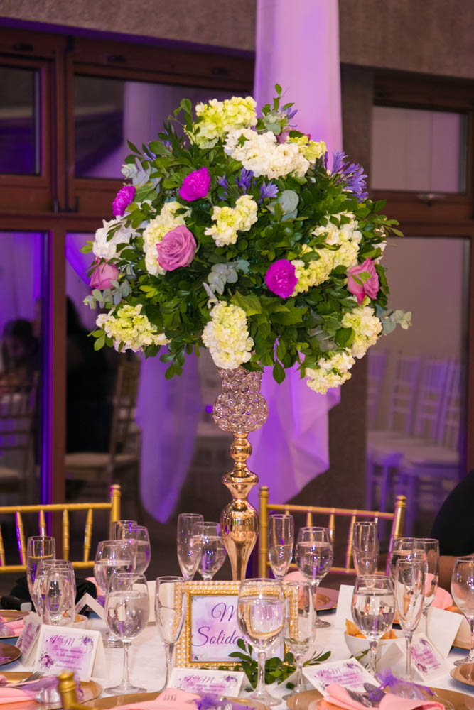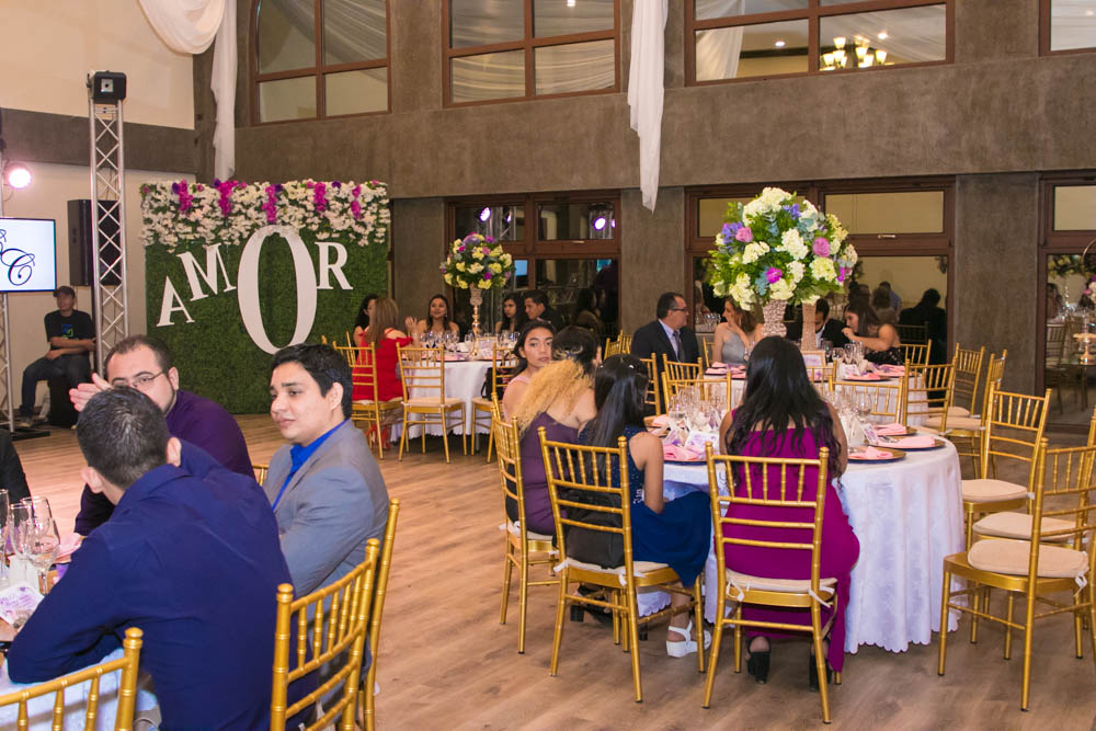 Mucho tono golden en sillas Tiffany y detalles, así como flores en tono fucsia, el verde, el lila y el púrpura, se combinaron con delicadeza de follaje, crearon un ambiente de romanticismo.