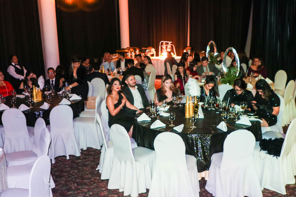 El salón Manage del Club Hondureño Árabe ha sido transformado en una fantasía retro inspirada en el famoso film The Great Gatsby, temática elegida para la recepción navideña.