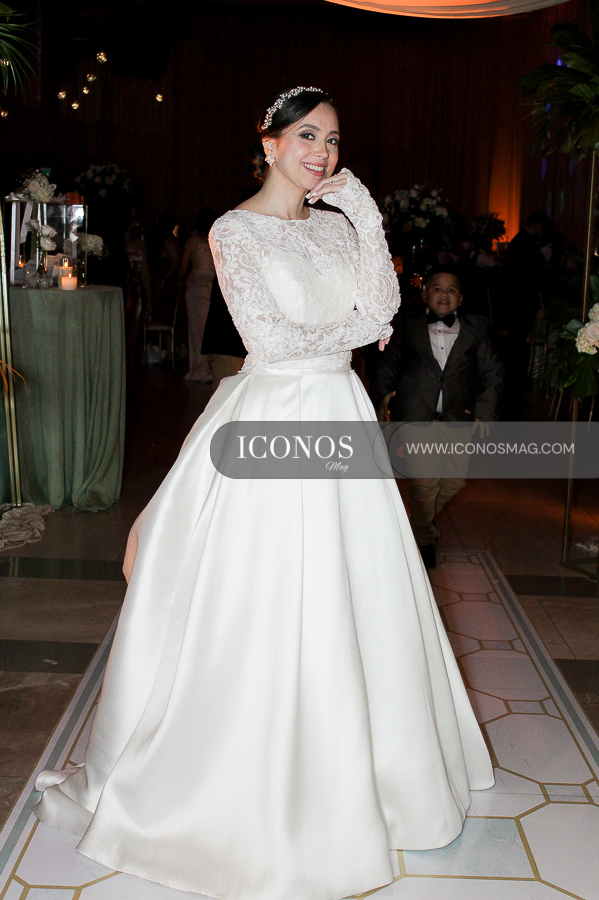 La novia ha lucido un vestido con manga larga de blonda y una falda amplia sin volumen y con una cola confeccionada en tela satin de la línea Coral Gables, adquirido en Pronovias en Miami.