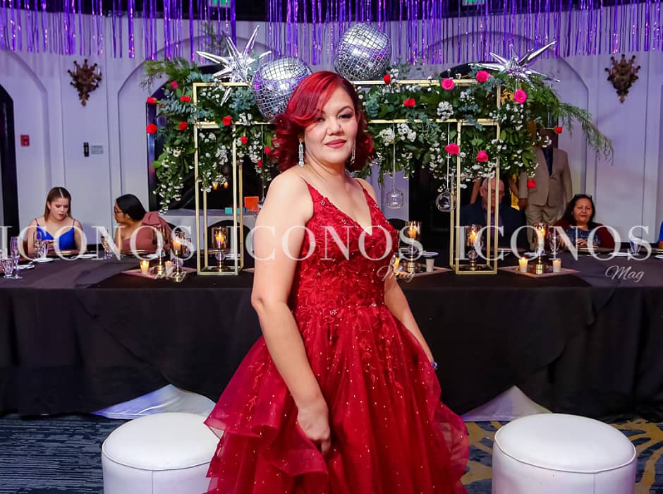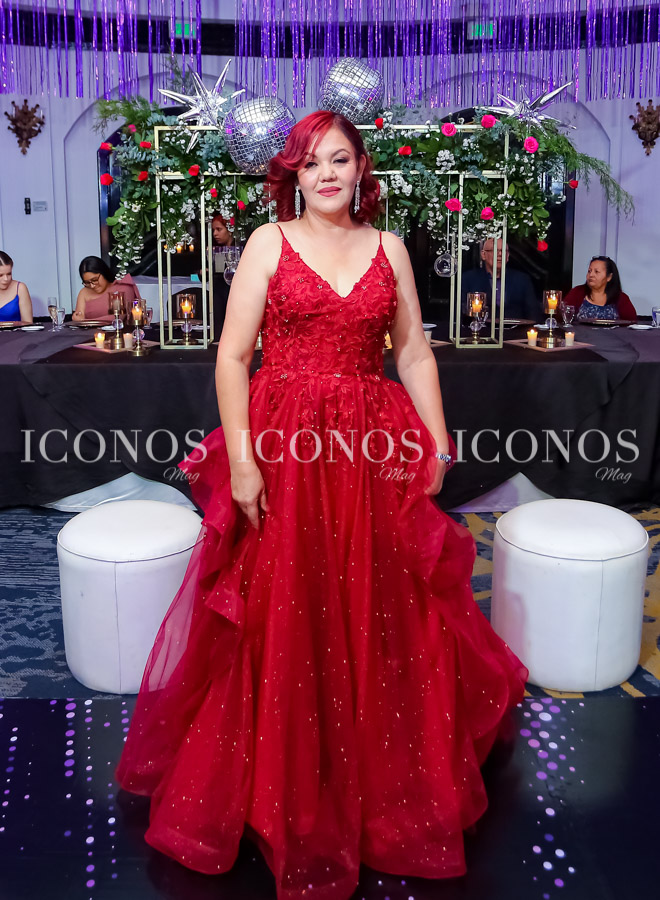 La cumpleañera ha sido el centro de atención de la velada con su elegante vestido rojo con escote corazón, tirantes espagueti y falda con capas, cubierto en brillos, adquirido en Oribela.