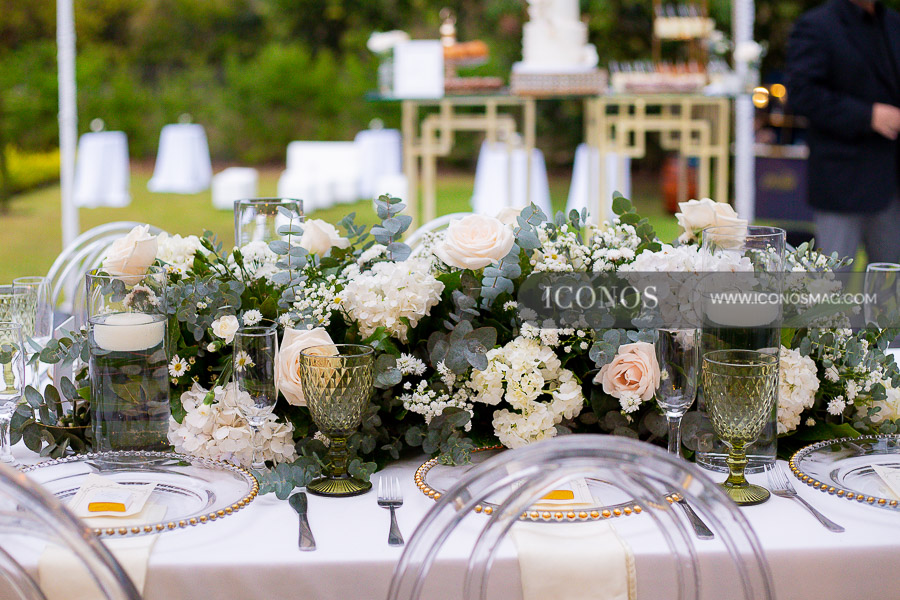 El display ha incluido mesas circulares revestidas, sillas Chanel ghost, cristalería y velas eternas. Los invitados se han deleitado con una pastry table y un cake de bodas de tres niveles en el tradicional tono blanco.