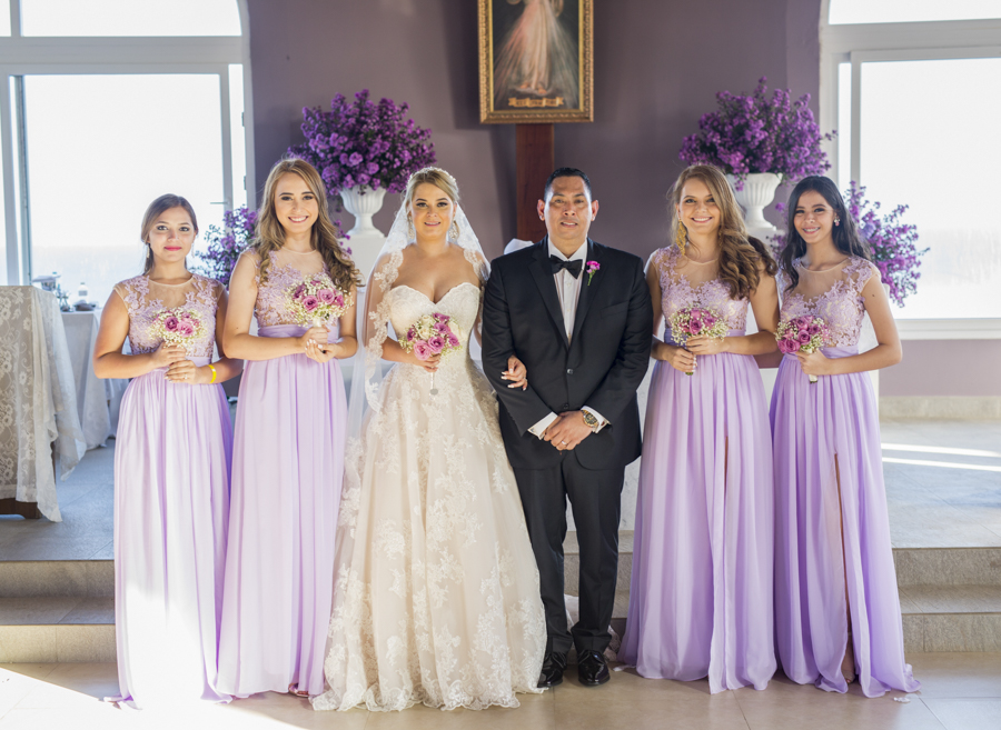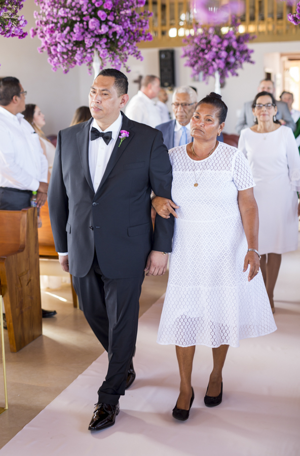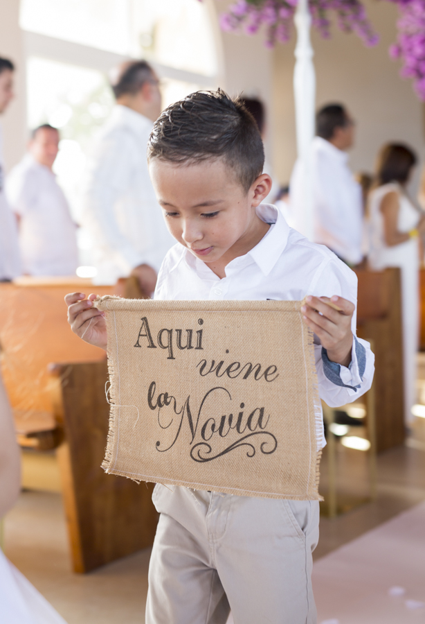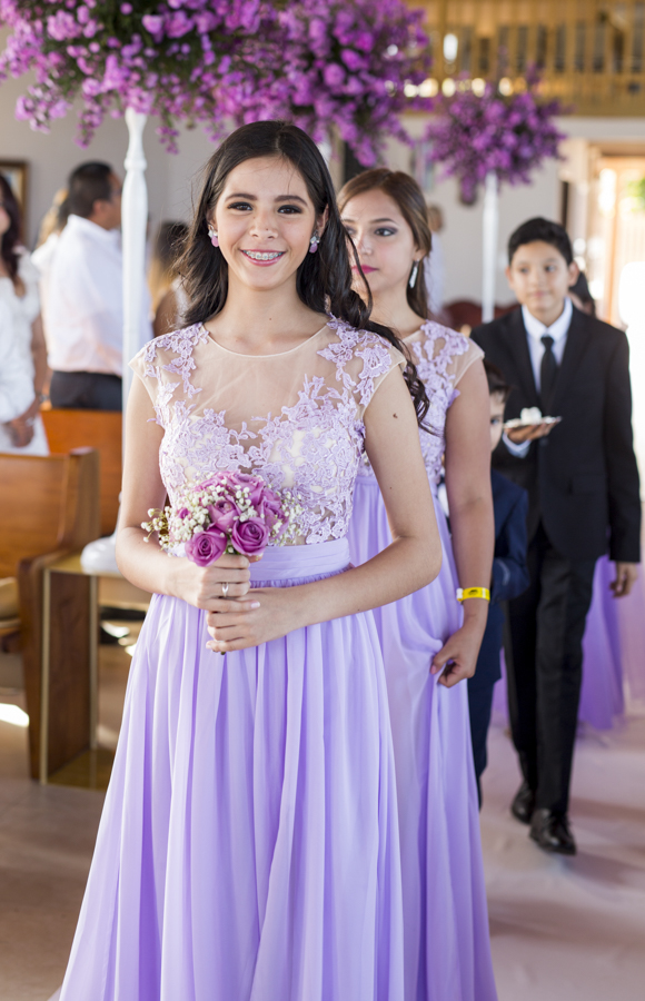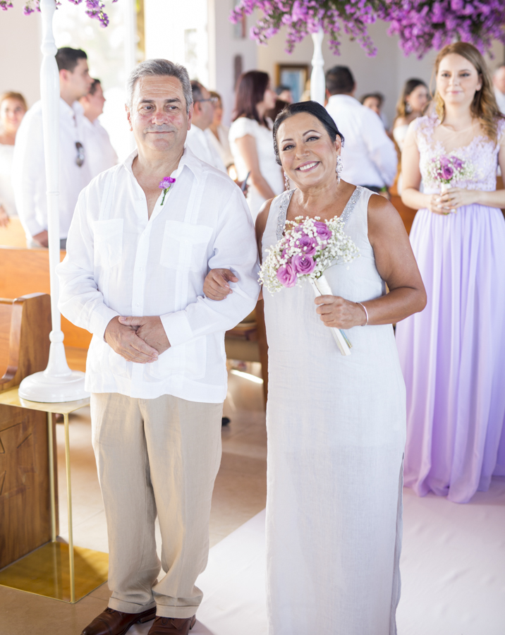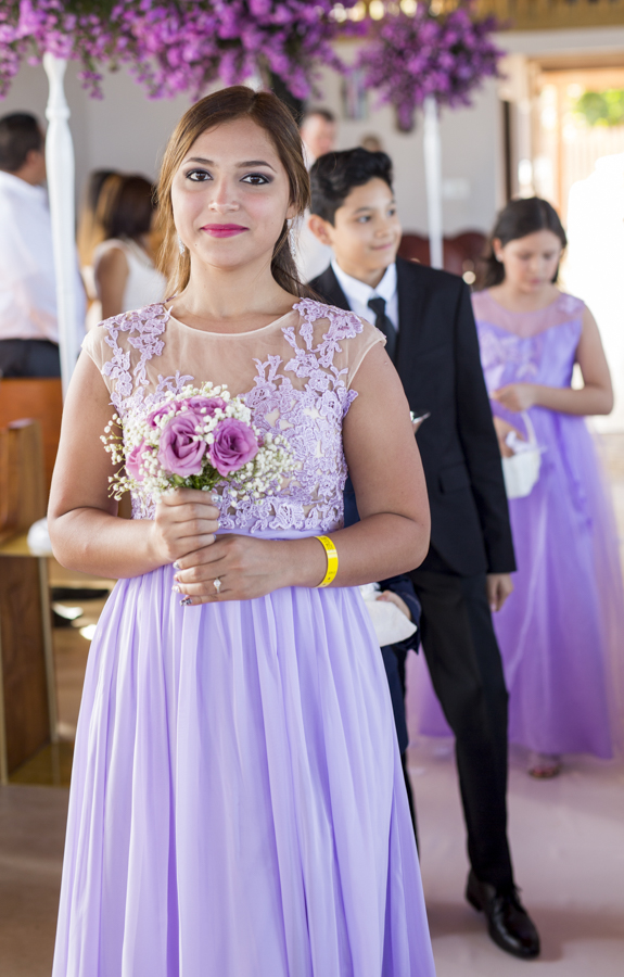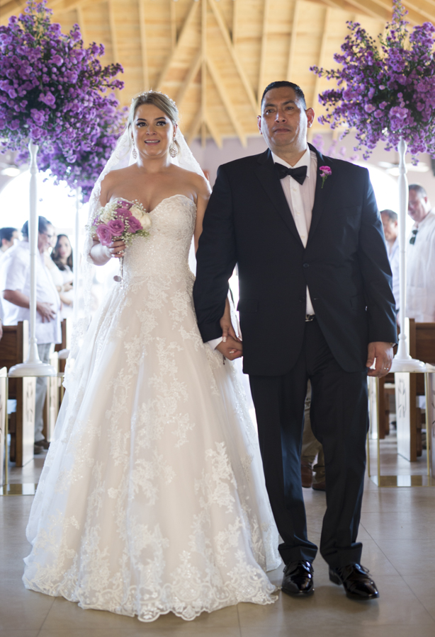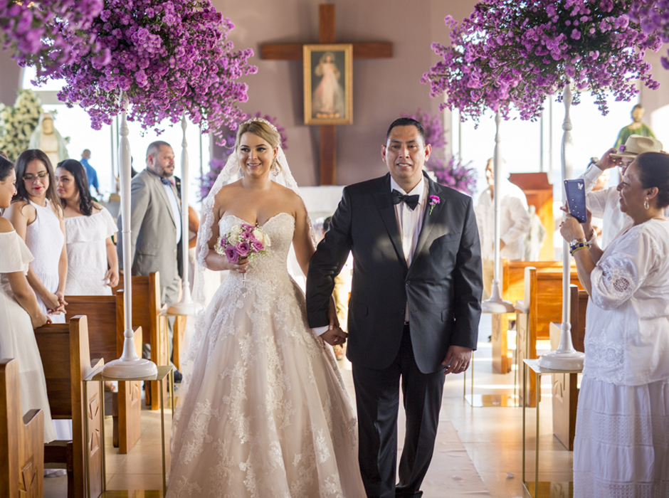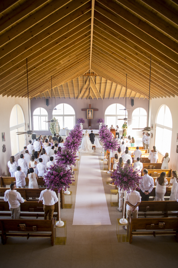 [/vc_column_text][thb_gap height=»30″][vc_column_text]La diseñadora de eventos Alexandra Lockmer, se encargó de que el recinto católico luciera acorde con la romántica cita. Para ello, incluyó en la decoración esbeltos arreglos florales con llamativas flores de áster en tonos lavanda.Tras la boda religiosa, los invitados y familiares se trasladaron junto a los novios; al exclusivo complejo del hotel Las Verandas en Pristine Bay. Allí, justo en las blancas arenas de la costa, los esposos obtuvieron también la bendición evangélica.