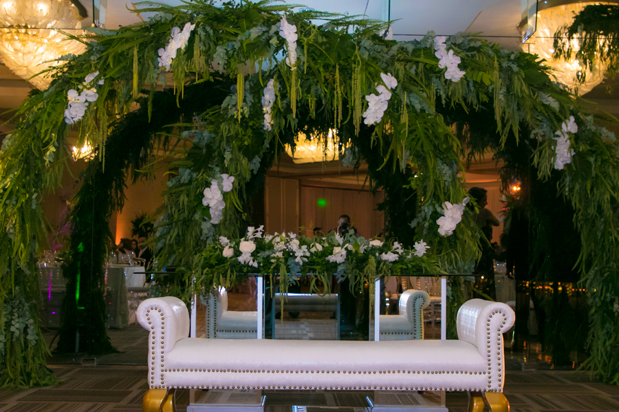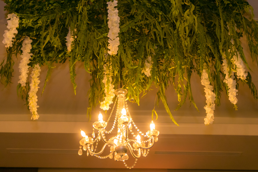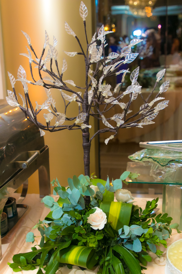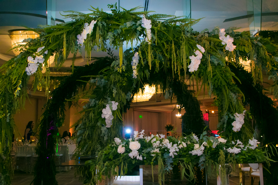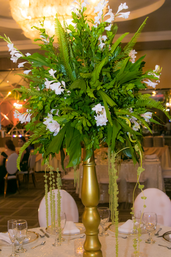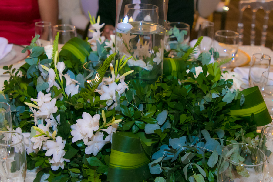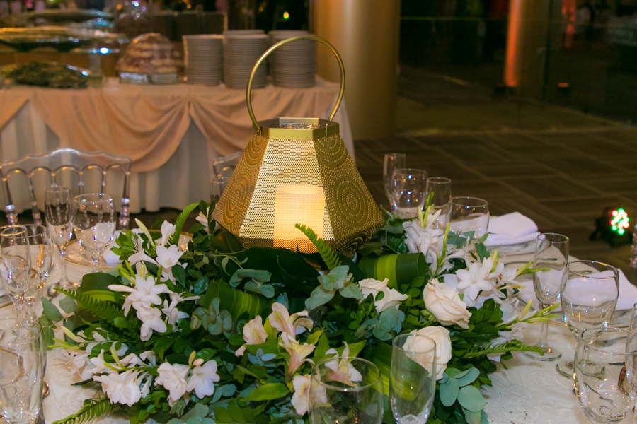 Mucho eucalipto, sauce de montaña, amarantos, agapantos, hojas exóticas, rosas y nardos, las que crearon los arreglos en tornos espigados y lámparas golden.
