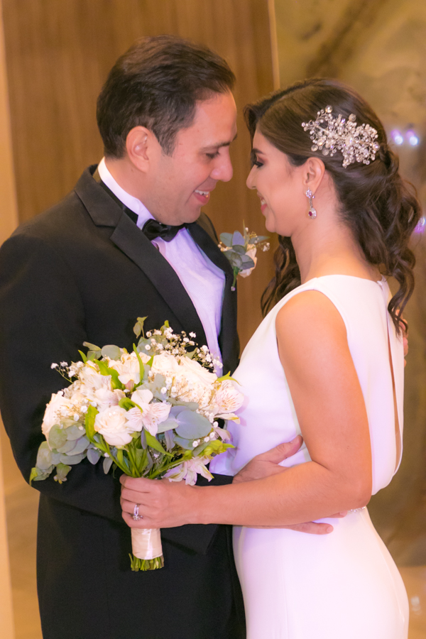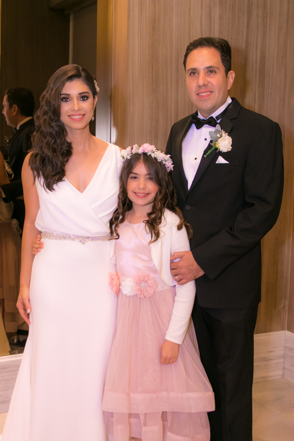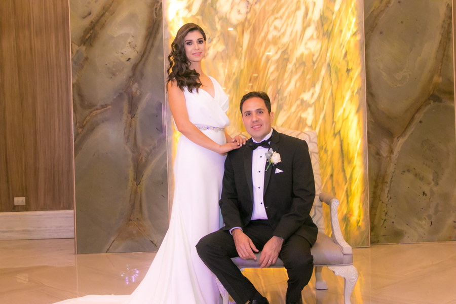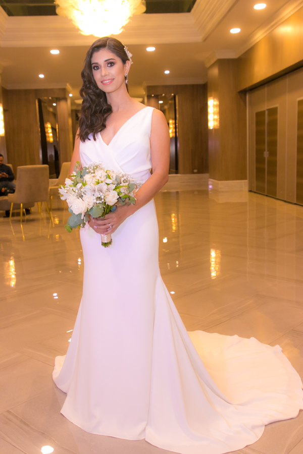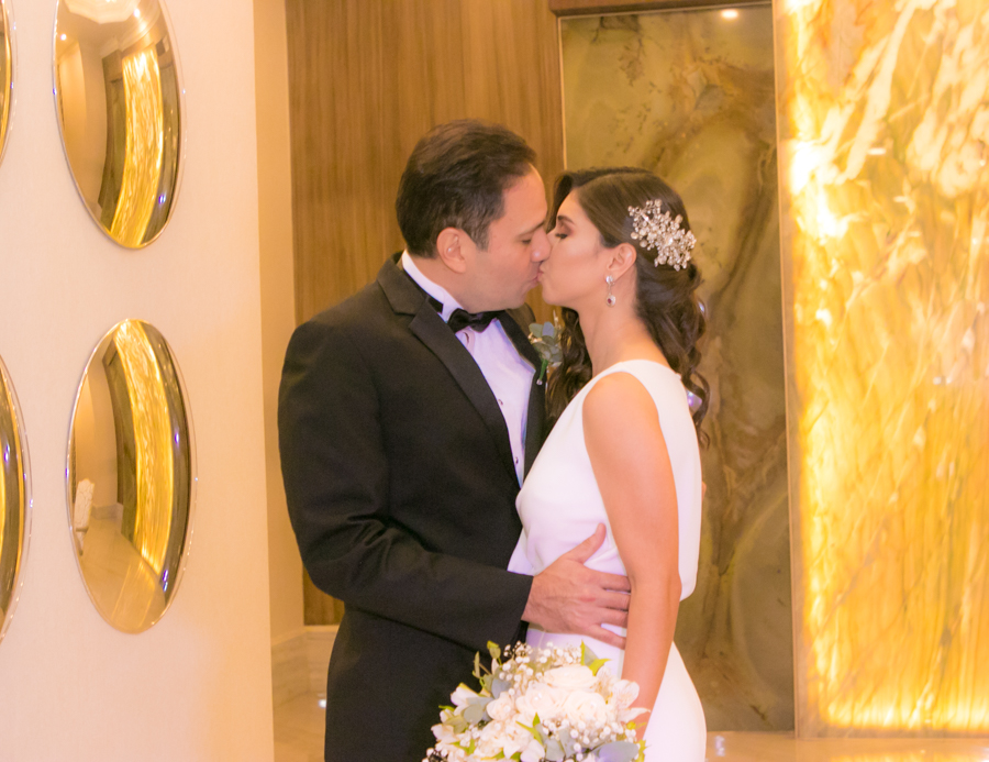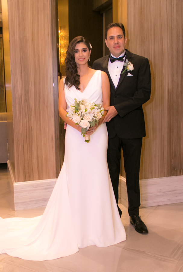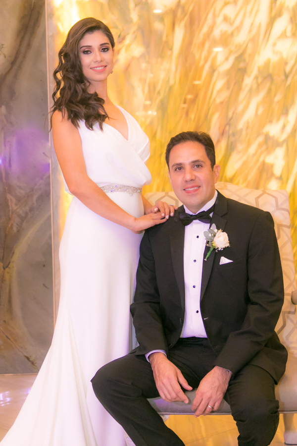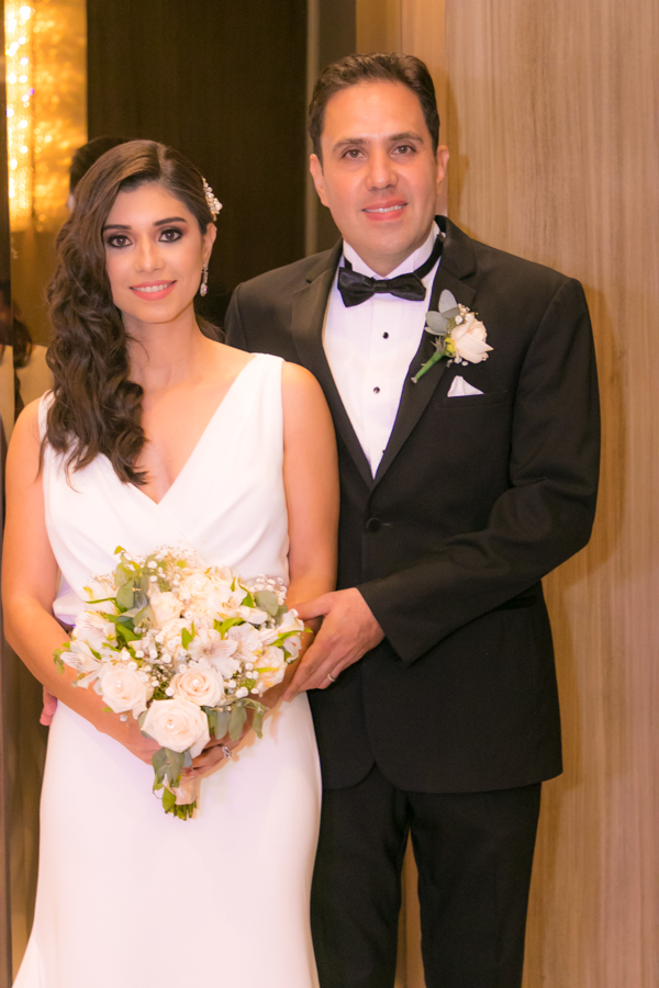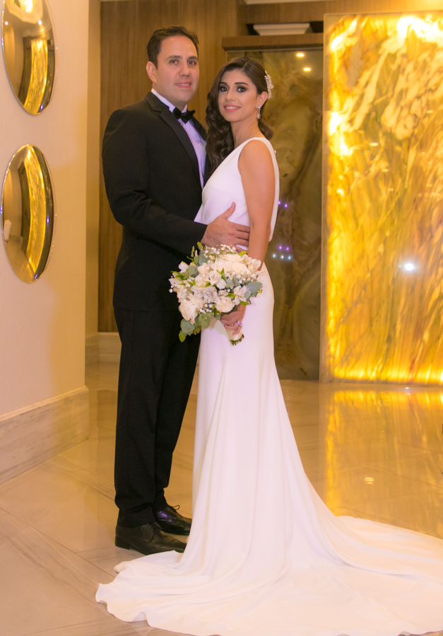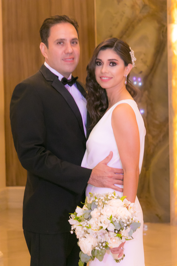 Laura Zelaya y Gerardo Gutiérrez estaban de lo más felices y elegantes. Ella se decantó por un diseño muy propio y de impecable confección en crep de seda de espalda vértigo y larga caída godet de la firma Atelier Pronovias de España. Él, de clásico traje formal.