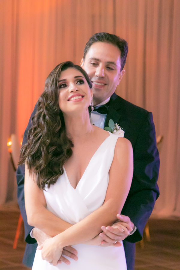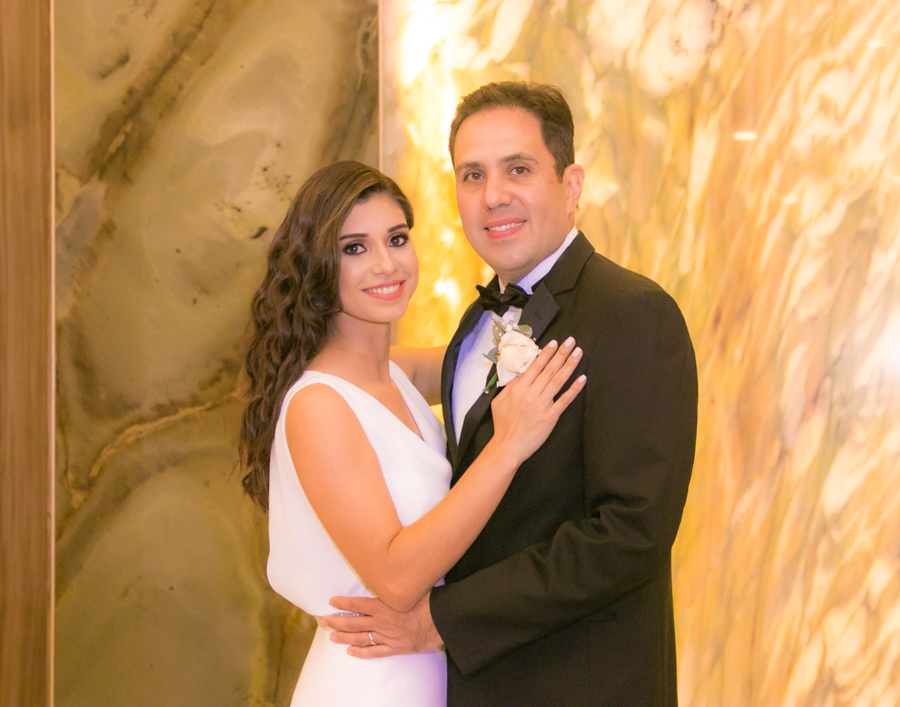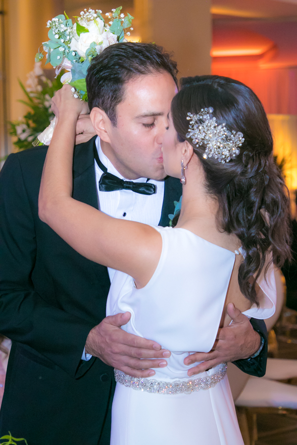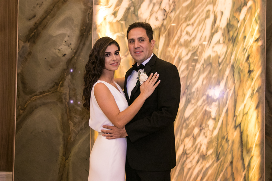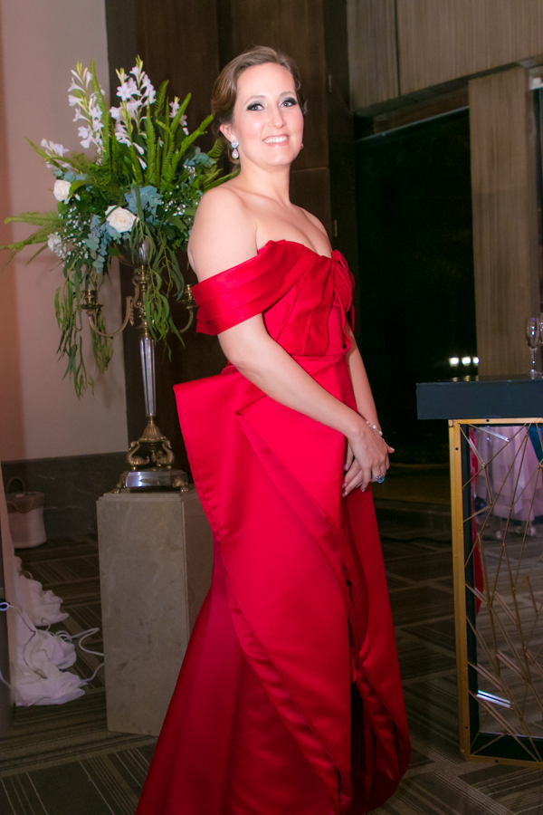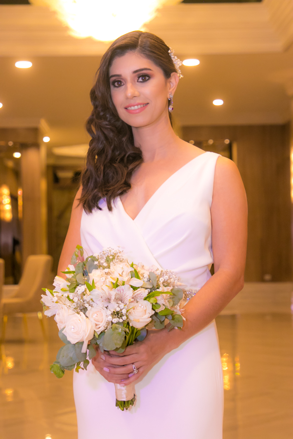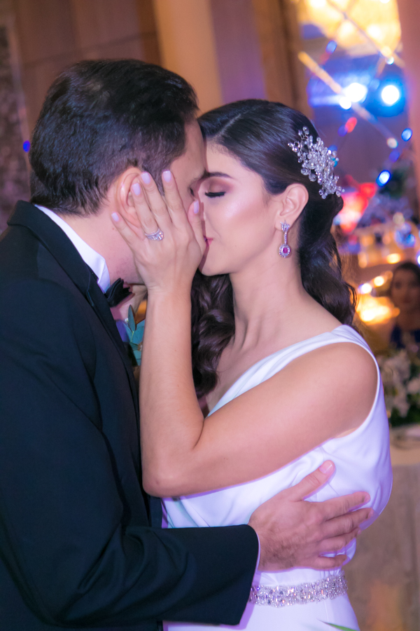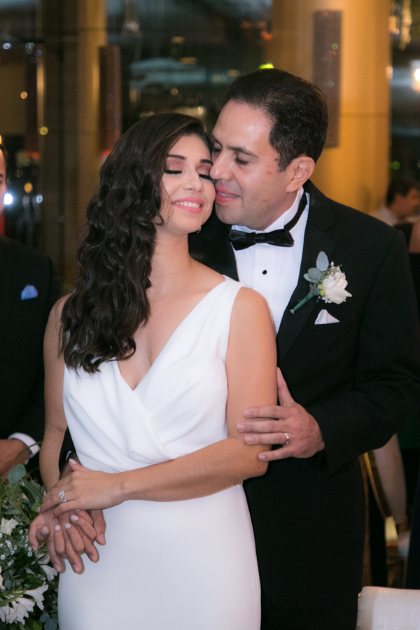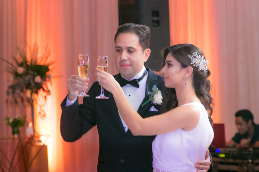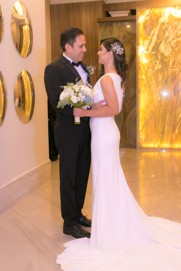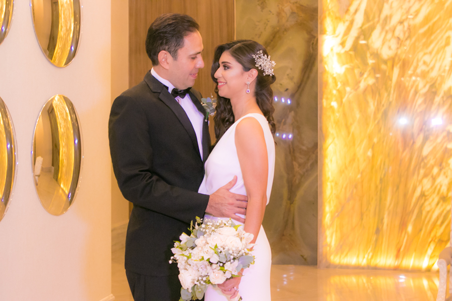 Laura Zelaya y Gerardo Gutiérrez estaban de lo más felices y elegantes. Ella se decantó por un diseño muy propio y de impecable confección en crep de seda de espalda vértigo y larga caída godet de la firma Atelier Pronovias de España. Él, de clásico traje formal.