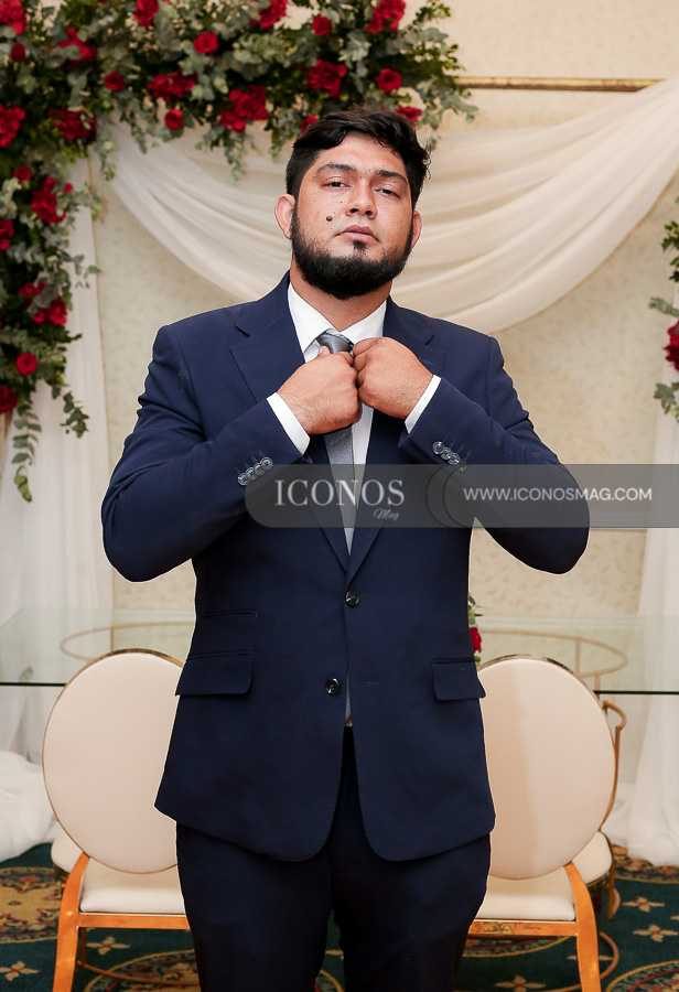 El novio se ha ataviado de un tuxedo en tono azul marino, que incluye una chaqueta y pantalones a juego, lleva una camisa blanca de vestir y una corbata gris. El conjunto le ha dado un aspecto formal.