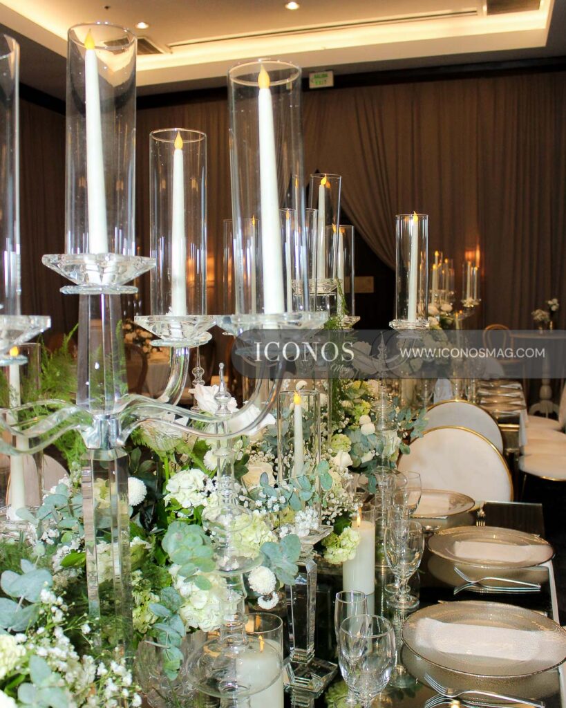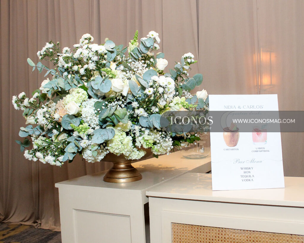 El salón ha contado con un juego floral de hortensias, rosas y claveles en colores white, mesas circulares e imperiales al desnudo con cristalería y sillas Oval, creación de Jackeline Cabrera.