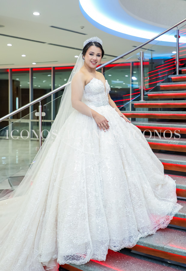 Para el día soñado, Patricia Jackeline se ha visto como una princesa con un vestido de escote corazón de amplia falda.