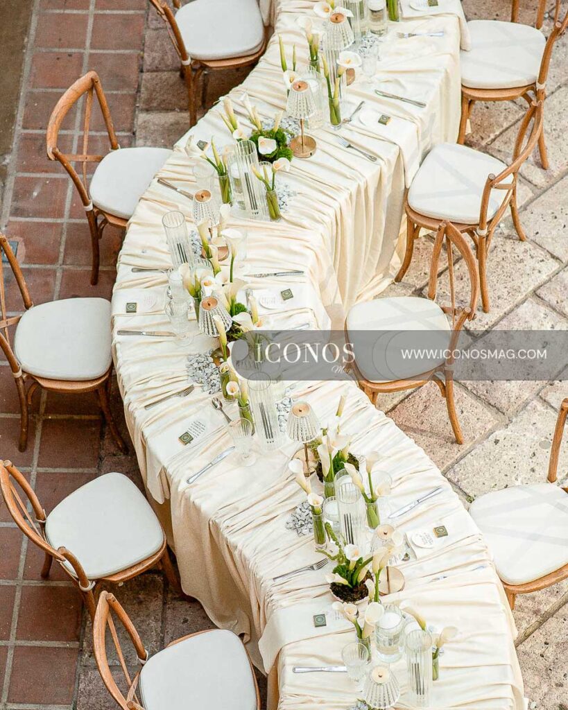 La wedding planner Fabiola Matamoros ha sido la artífice de la puesta en escena que ha destacado telares entrecruzados creando una perfecta caída drapeada de elegancia atemporal.