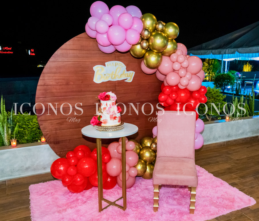 Marcela Cueva ha sido elegida para crear el ambiente perfecto y para la puesta en escena, se ha colocado un backdrop adornado con globos golden, rosado y rojo. Asimismo, arreglos florales de rosas rojas.