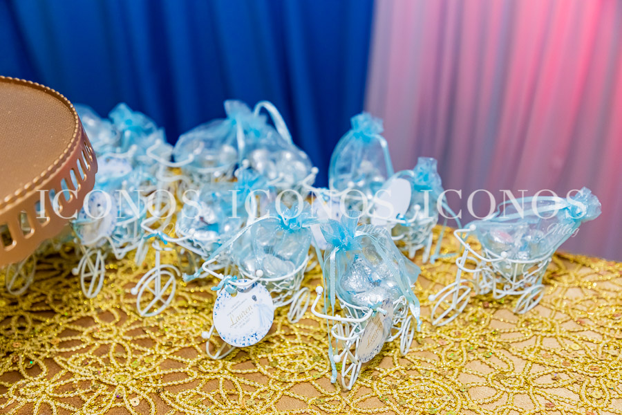 Se ha elegido un pastel con detalles vintage en colores azul, rosa y dorado, y como topping un carruaje
