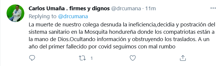 En redes sociales, muchos residentes de la Mosquitia hicieron un llamado a las autoridades de salud y gobierno en general para que pusieran a disposición una avioneta para el traslado urgente del galeno a Tegucigalpa.