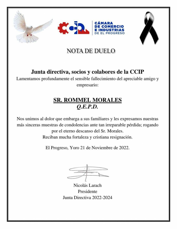Fue miembro de la Cámara de Comercio e Industrias de El Progreso CCIP, donde destacaba por su liderazgo e ingenio empresarial.