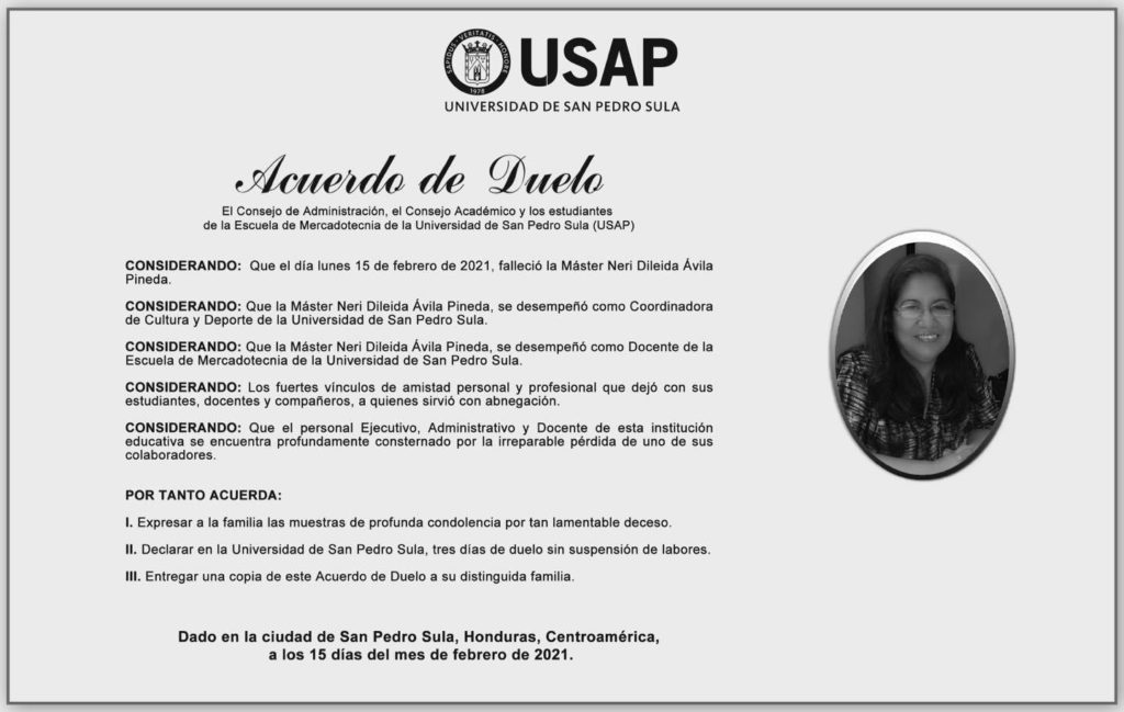 «Formadora y mentora de generaciones, ahora descansa en paz. Gracias a Dios y USAP por permitirnos contar con la excelencia profesional de la lic. Neri Ávila ahora a cosechar en el cielo lo que sembró en la tierra».